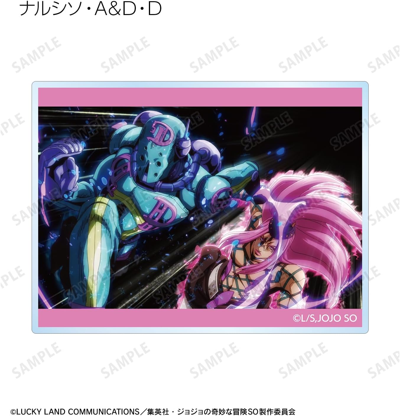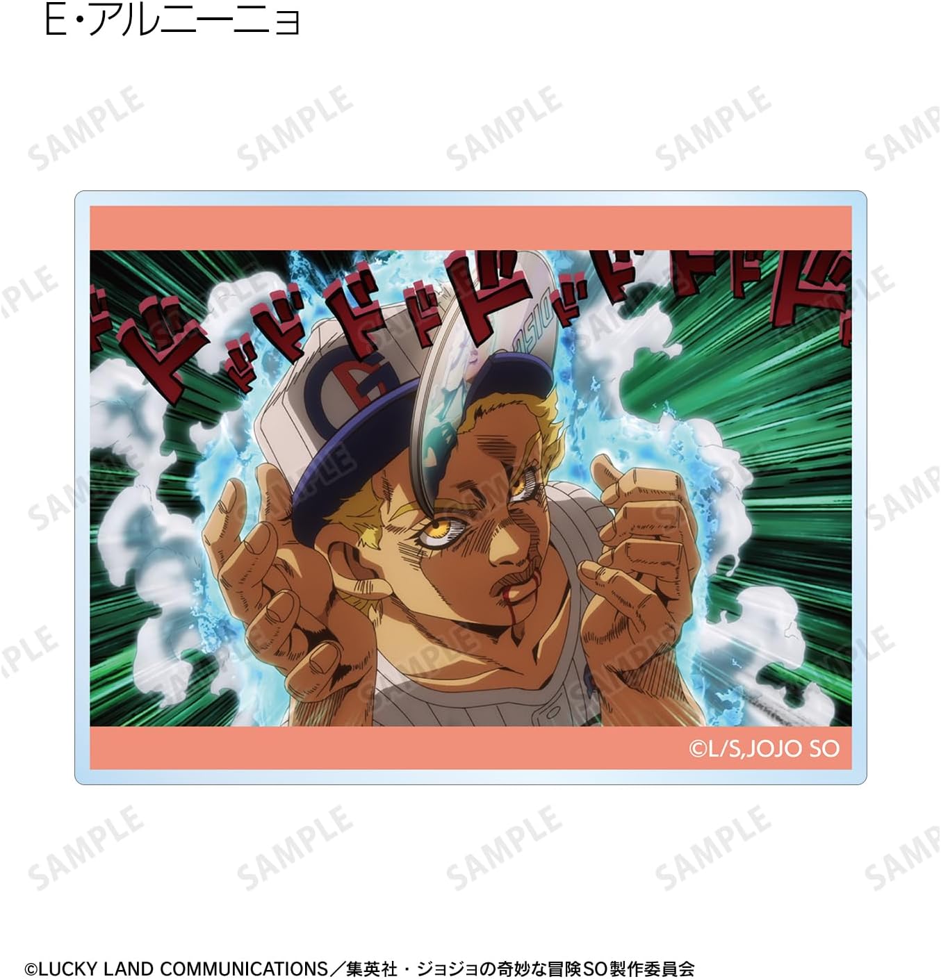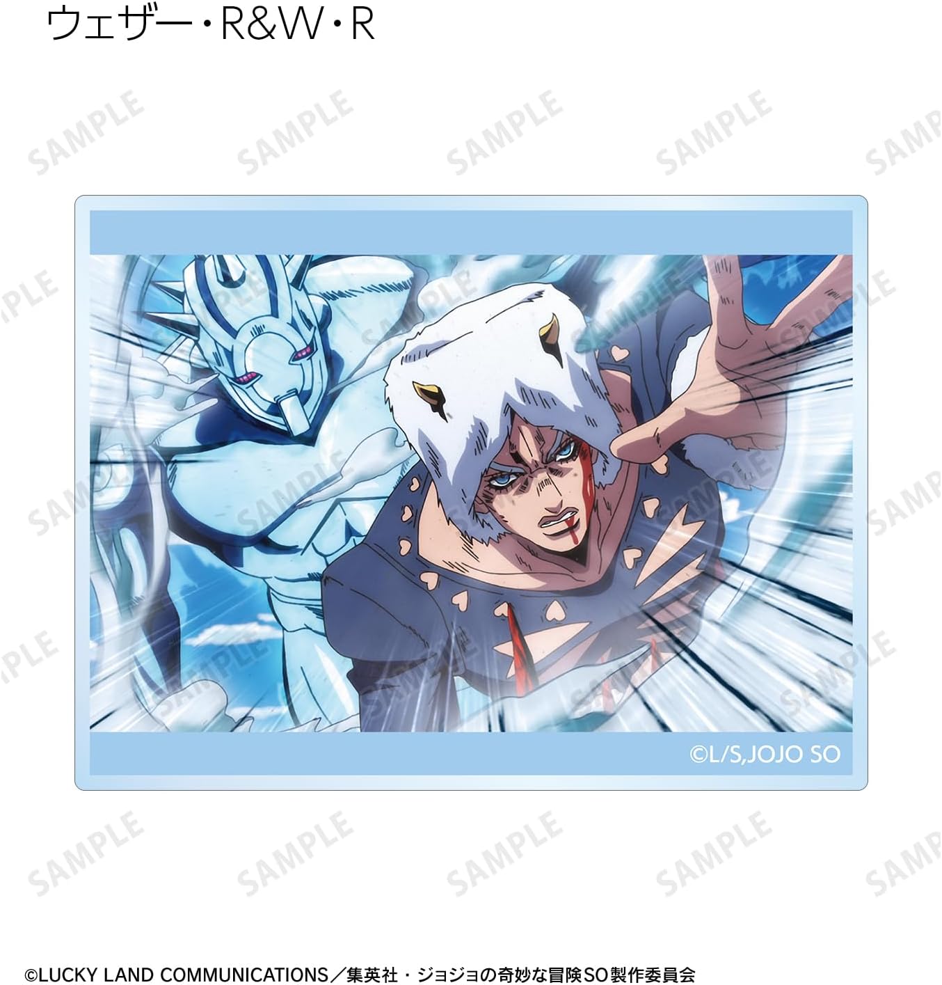 From Jojo's Bizarre Adventure Stone Ocean Trading Acrylic Cards. A striking scene from Kuroji, S, F, E, Costero, Ki, Fu F, E. Arnino, Weather R, W R, Narcisso A, D, Jotaro Kujo, Sp, Enrico P, W. Decorate your room or desk and enjoy your daily life with your characters.