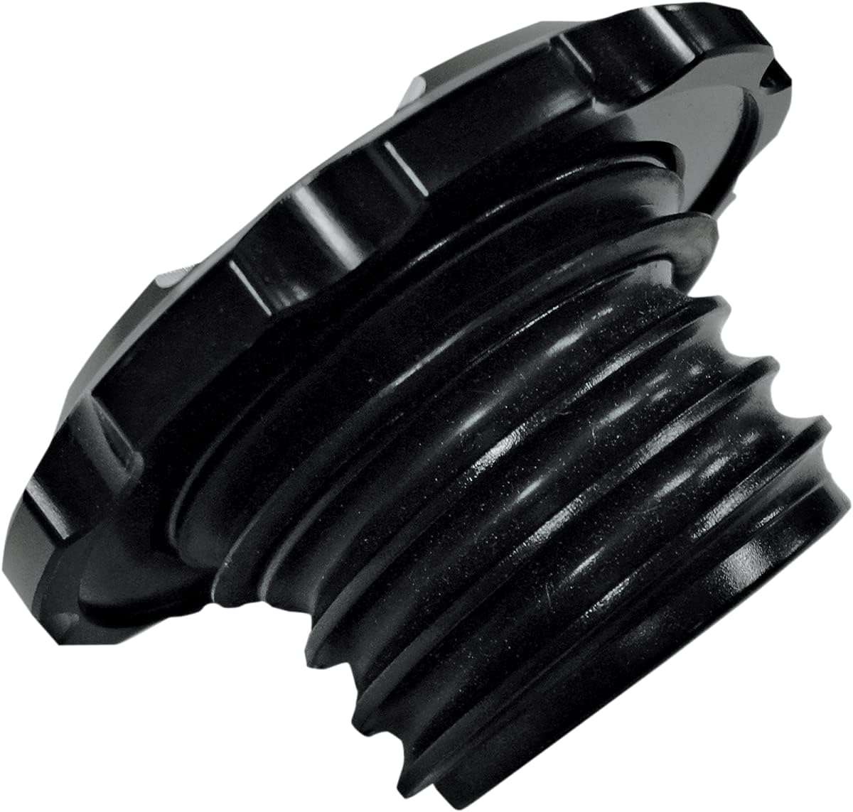 • Made with finger serrations for a much easier removal over the stock smooth-sided gas cap• Super-clean and low-profile design features all CNC-machined billet aluminum construction throughout• After being tightened down, the cap can rotate to any position to align design pattern• Hard black anodized finish• High-quality gas cap base has right-hand threads and is vented• Dimensions are 3" diameter, 1/4" thick at the edge and 9/16" thick in the center