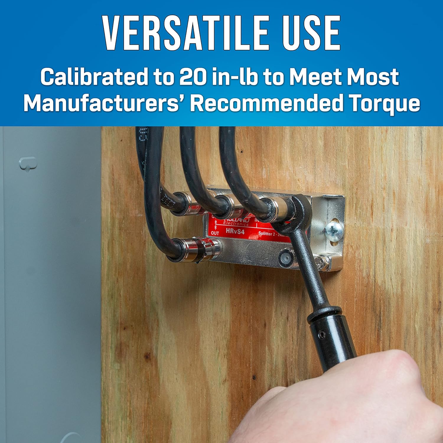 Designed for 7/16” F connectors, this full-size open head torque wrench provides a perfectly calibrated amount of torque to prevent damage from over-tightening or signal loss from under-tightening. This torque wrench features the following: provides a snug fit when used on 7/16” F connectors, ergonomically designed with an angled head and cushion grip for maximum leverage and comfort, calibrated to 20 in-lb (2.26 N-m) to consistently meet most manufacturers’ recommended torque requirements for their F connectors, audible click lets you know when the connector has reached its maximum torque, made of high carbon steel with a black oxide finish for maximum durability. Torque wrench is 6 1/2" inches long..