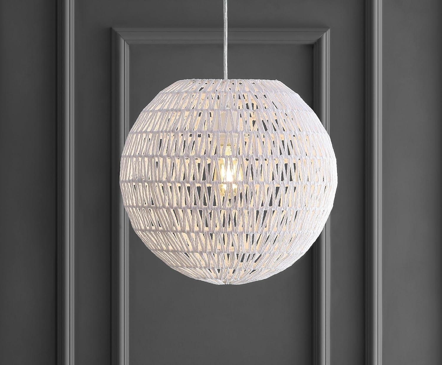 Modern design meets traditional craftsmanship in our white woven globe pendant. Made from paper wicker woven onto a sturdy metal frame, this ceiling fixture adds a Bohemian touch to your living room, bedroom, or dining room.