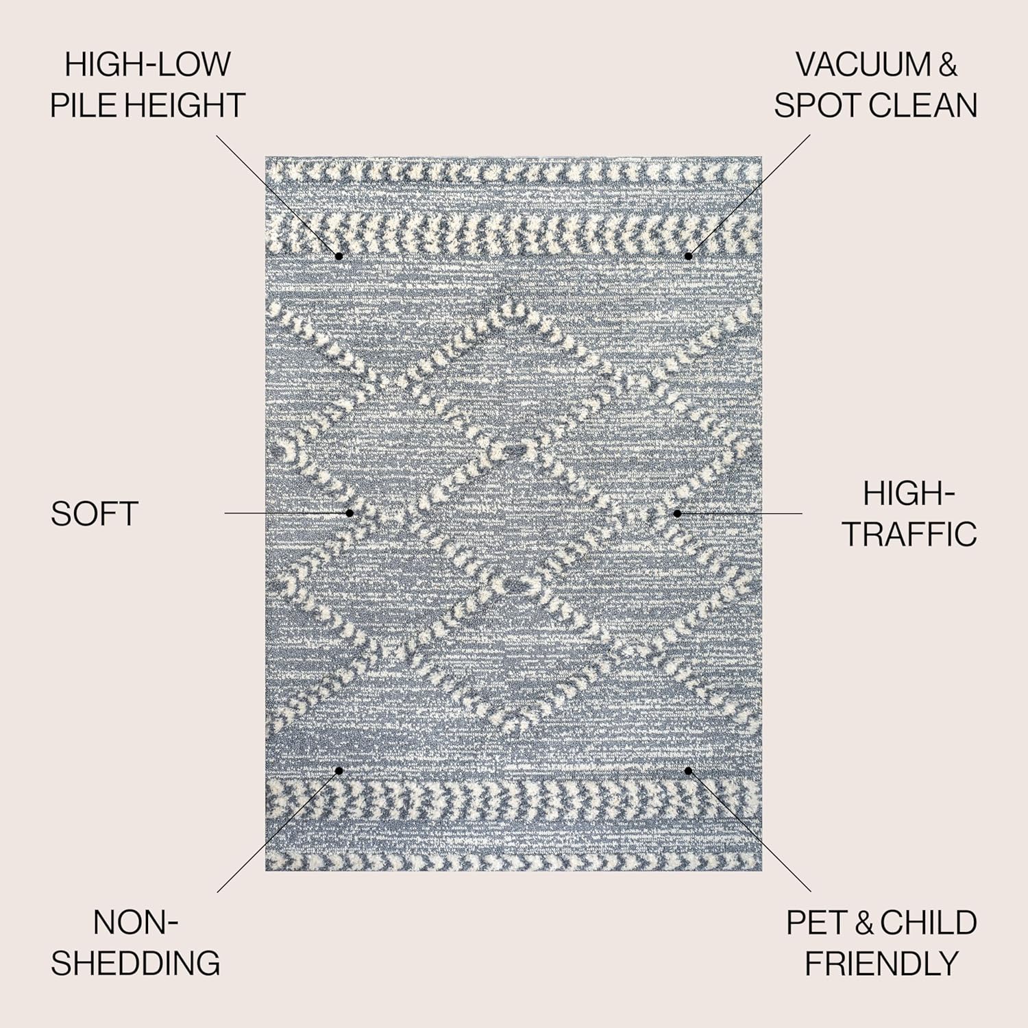 Mingled threads form diamond trellis on this modern version of a Moroccan rug design. The geometric pattern is practical for busy families, and adds texture to the living room, bedroom or home office. This versatile rug fits in anywhere, from a modern, minimalist interior to a Boho loft or coastal cottage.