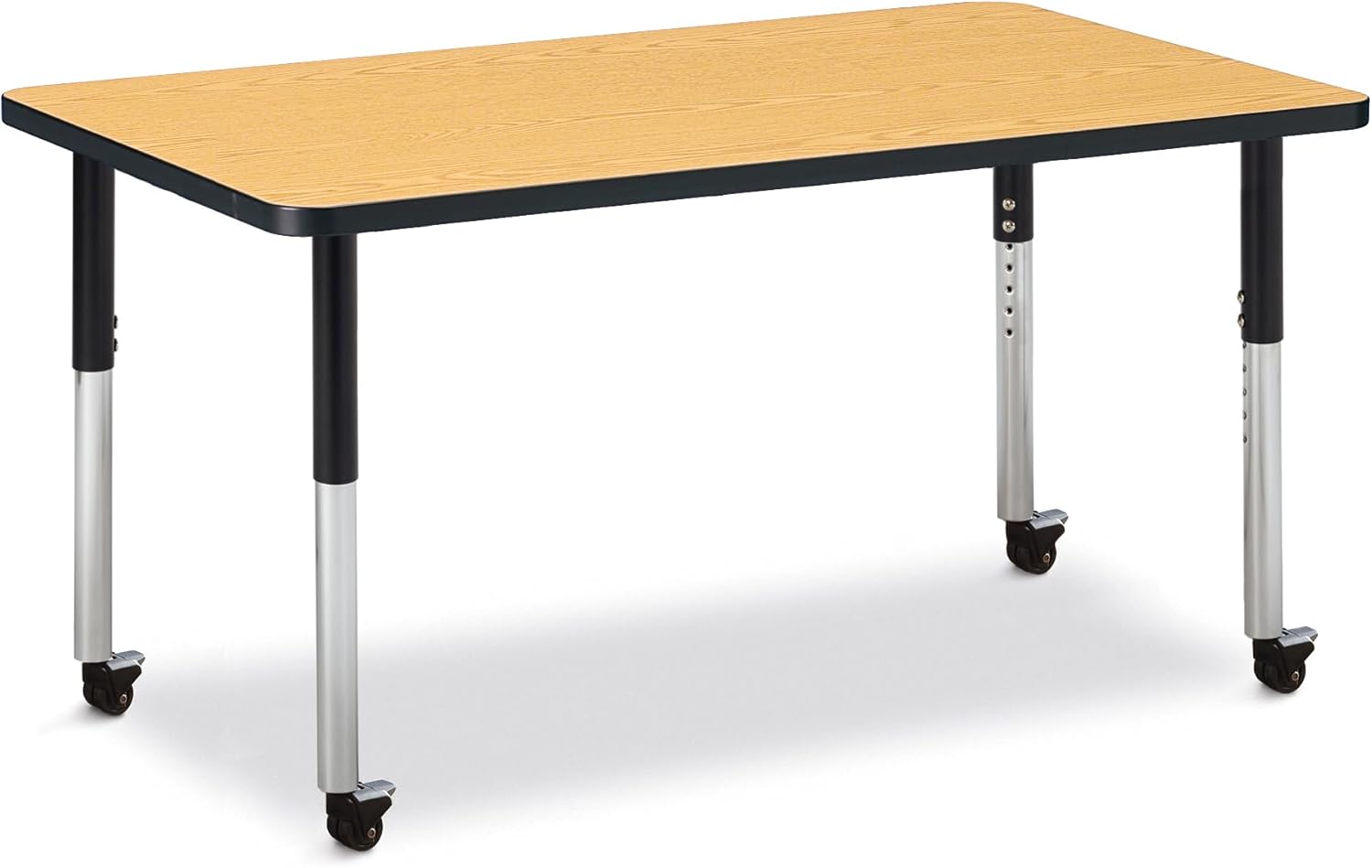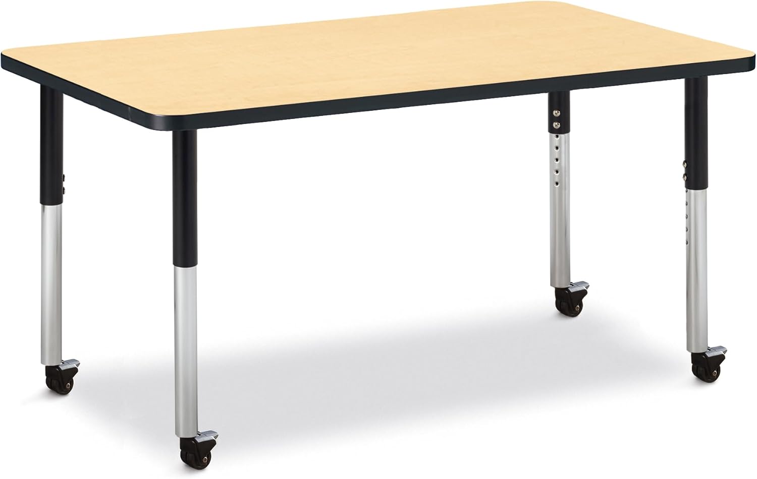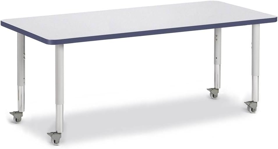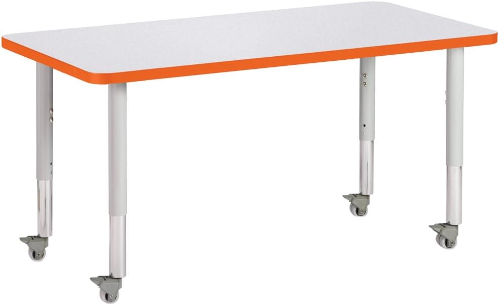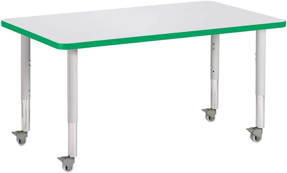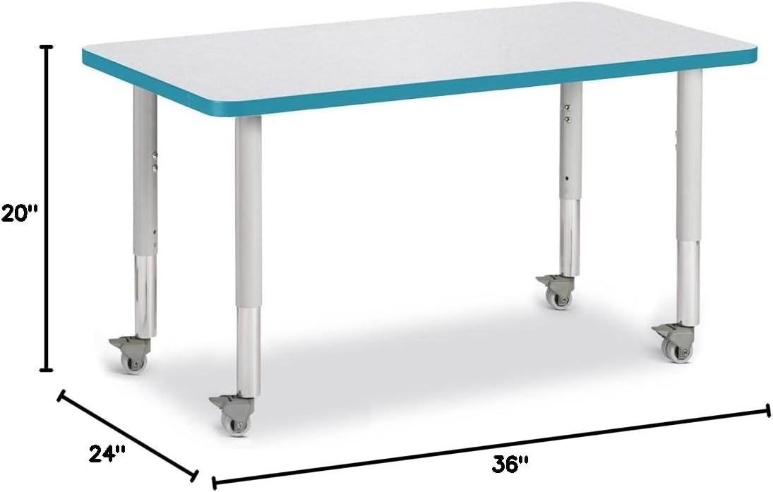 Ships in two boxes; The perfect table for any occasion. Accommodates up to 4 chairs. The legs adjust from 20” to 31” high, are 2” thick, and feature heavy-duty casters. Freckled gray tabletop with teal TRUEdge, gray legs, and gray casters.