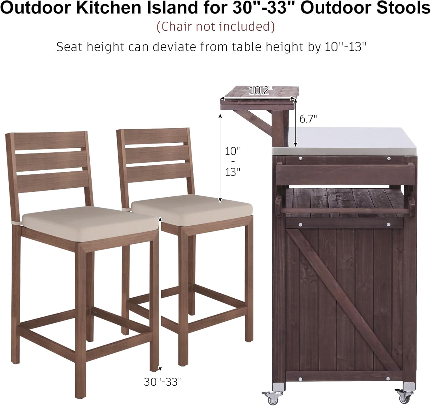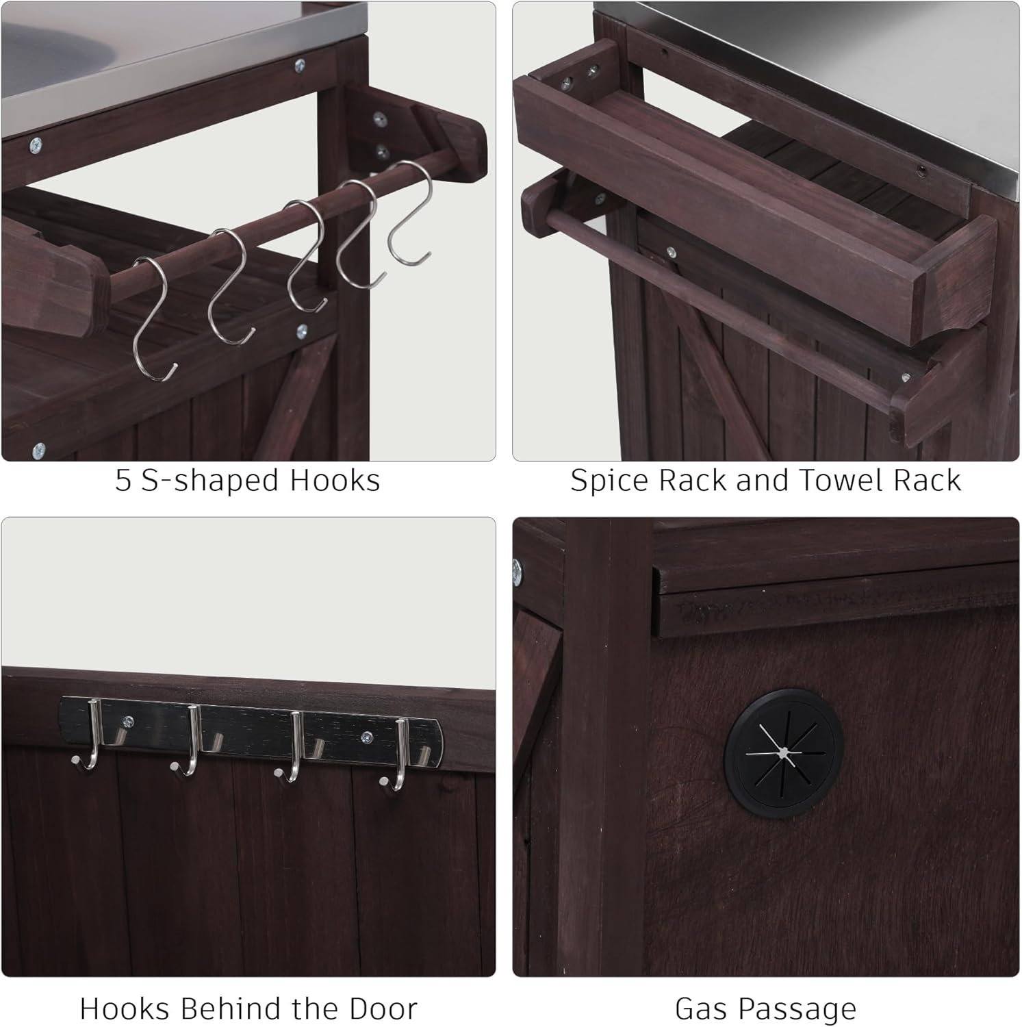 This outdoor rolling kitchen island is made of 100% fir wood and has a thick stainless steel top (easy to clean and durable). It features a raised shelf (expands grilling space), adjustable/removable shelves (fits propane tanks with a reserved gas channel), and internal storage racks. It also has side spice/towel racks, S-hooks, and magnetic door closures for secure storage. With 4 lockable 360° wheels for mobility, it comes with labeled parts and clear instructions for easy assembly, ideal for outdoor grilling.