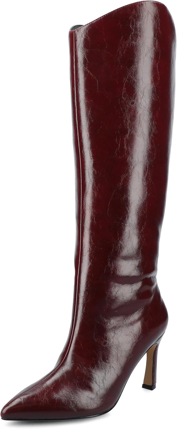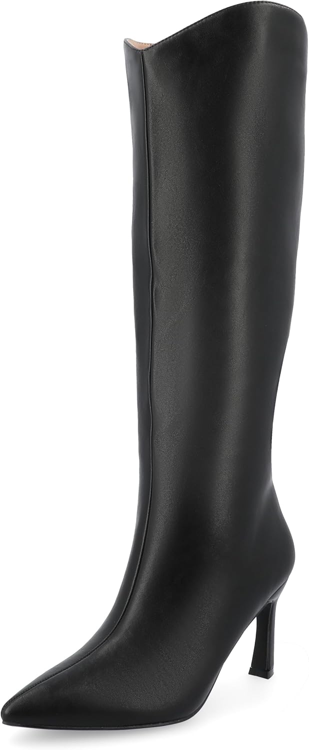 Introducing the Rehela boot by Journee, the perfect blend of elegance and comfort. Crafted with vegan leather, these boots feature a stylish stiletto heel and pointed-toe design, adding sophistication to any outfit. The 4 mm Comfort Insole insole ensures a cushioned step, while the pull-on style and center seam detail offer convenience and a sleek look. Step out in confidence with the Rehela boot.