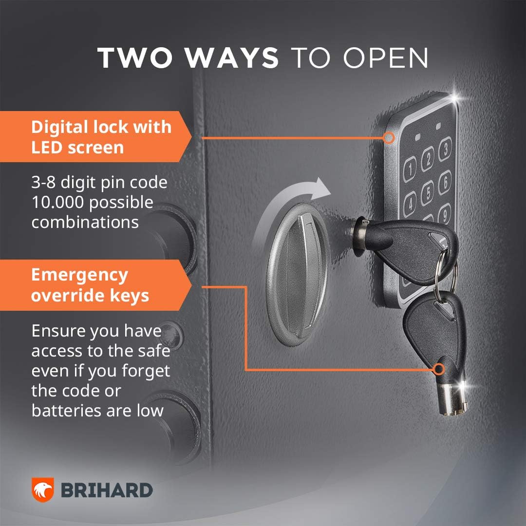 | Additional Features | Digitales Qualitätsschloss mit LED-Anzeigen. Erwartete Lebensdauer der Batterie 3.000 Operationen. Mechanische Notfallschlüssel (zwei Schlüssel enthalten). Garantie: 2 Jahre |