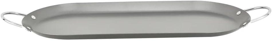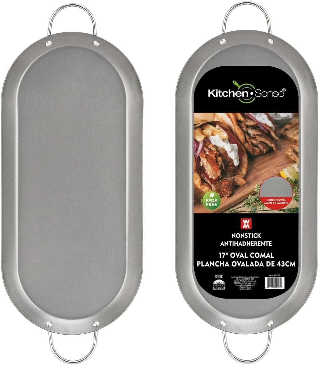 This versatile carbon steel nonstick comal from Kitchen Sense is an essential addition to any kitchen. Perfect for making tortillas, crepes, pancakes, and more, this round griddle features a premium nonstick coating that ensures effortless food release and easy cleanup. The carbon steel construction provides excellent heat distribution for consistent cooking results, while the PFOA-free nonstick surface offers peace of mind for health-conscious home cooks. Equipped with sturdy metal handles on both sides, this comal allows for safe and convenient handling whether you're flipping, transferring, or serving. The handles stay cool enough to grip during stovetop use and provide a secure hold when moving the pan. Available in multiple sizes including 11-inch, 13-inch, and 17-inch oval options, you can choose the perfect dimensions for your cooking needs. Whether you're preparing breakfast for the family or hosting a gathering, this durable and practical comal delivers reliable performance for all your griddle cooking tasks.