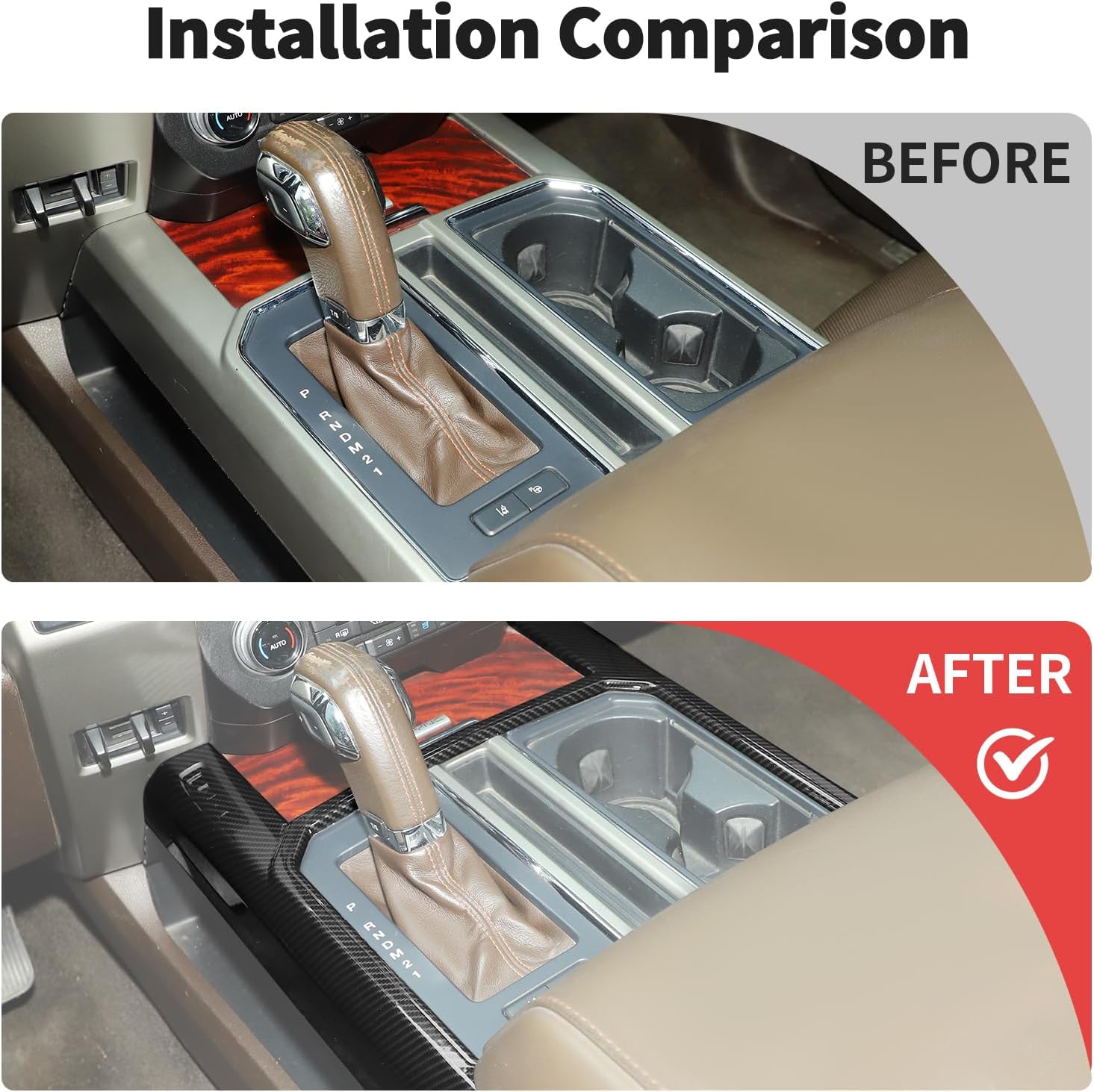 Model: -Center Console Gearshift Cup Holder Panel Cover Compatible with 2015-2020 Ford F150 F250 F350 F450 Interior AccessoriesFeature: -Material: Made of Excellent Quality ABS plastic.This kind of material is strong and wear-resistant, and the adhesive can make the accessories fixed on the instrument very well. -Provides a high class, unique and fashion decor style to enhance the visual appearance of your car. It can cover existing scratches and prevent your door Door Handle from fingernails, key scratches and etc. Dress up your Door Handle and makes your car out of ordinary.Installtion Notes -1.Clean all positions with rubbing alcohol where will be covered in the Corresponding parts plate(Very important); -2.Make sure you heat both the accessories and the tape on the cover piece; -3.After the alcohol is dry, remove the protective film from the Double- sided tape on the back of the product; -4. Paste the accessories in the corresponding position and press it with your hand to make it more solid.After sales service -Our all products have 30 days of after-sale protection and 2 years services -If you have any suggestions or questions for our products, please tell us as soon as possible.Package Include: 1pc*Armrest Cup Holder Panel