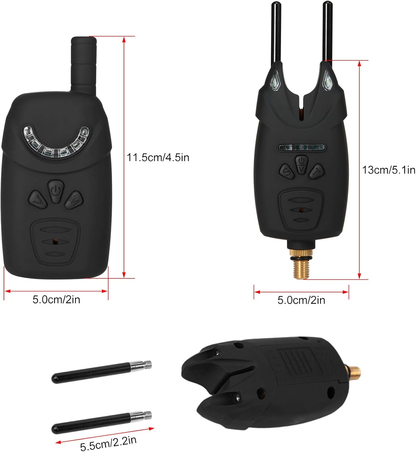 JY-7 Electronic Fishing Bite Alarm, LED Sound Alert Alarm with Digital Receiver, Adjustable Volume Tone, 9V Battery Operation, Carrying Case IncludedThis fishing alarm with LED indicator is very sensitive to fish which swallows the bait, it sounds loud so you can walk away or have a rest over one hundred meters. Features:-TransmitterSpecial varnish decorations.Low battery signal.LED alarming signals with high output speaker.High visibility LED latching about 15 seconds.Aluminum removable snag bar.Warning LED light with color of Red, Blue, and Yellow.Adjustable Volume, Tone button.Protective coated electronics.Separate battery compartment.Work with a 9V battery(not included).-ReceiverOver 100m transmission range.256 variable code enough to prevent interference from another angler.Special varnish decorations.Low battery signal.On/off, adjustable Volume, Vibration button.6 colors LED lights to match 6 alarms.Protective coated electronics.Separate battery compartment.Black antenna.Working with 3 AAA batteries(not included).Specifications:Material: ABSColor: BlackReceiver Size: 8.5 * 5 * 2.5cm / 3.3 * 2 * 1inCase Size: 30 * 20 * 6.5cm / 11.8 * 7.9 * 2.6inProduct Weight: 590g / 1.3lbPackage List:1 * Receiver3 * Transmitter1 * User Manual1 * CasePackage List:1 * Receiver3 * Transmitter1 * User Manual1 * Case