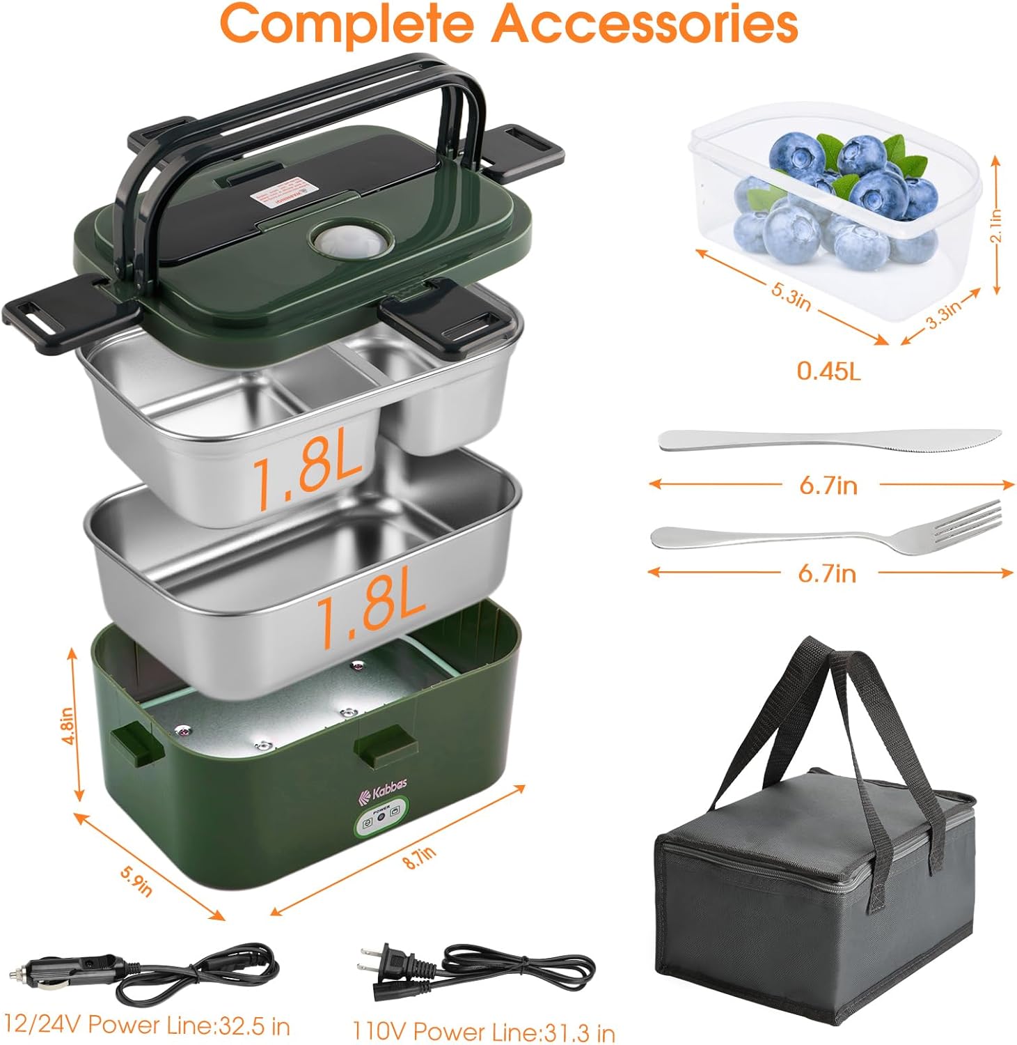 | Included Components | 304 SS Food Container(1.8L) x 2, Car/Truck Charger x1 + Home Use Adapter x1, Electric lunch box x 1, Insulated Lunch Bag x 1 + User Manual x1, Stainless Steel Knife & Fork x 1 + Fruit Box x 1 |
