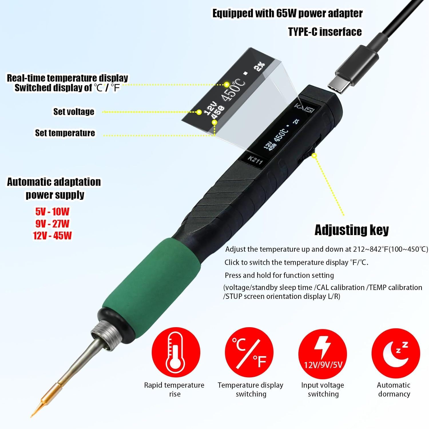 | Included Components | Soldering Iron Controllor,C210 Soldering Iron Tip - I,C210 Soldering Iron Tip - IS,C210 Soldering Iron Tip - K,65W USB-C power adapter,MINI soldering iron bracket |