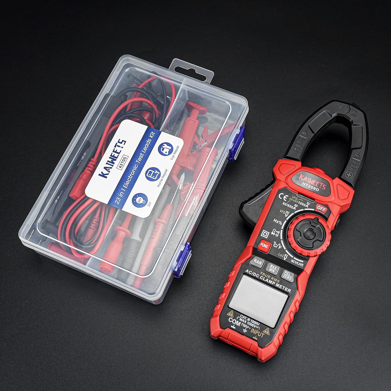KAIWEETS HT208D Inrush T-RMS 6000 Counts AC/DC Current Clamp Meter & 23 PCS Multimeter Test Leads Kit for Digital Electrical Testing