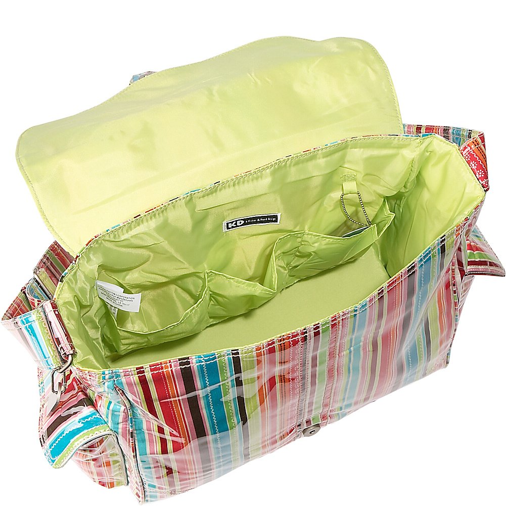 A magnetic clip keeps the top flap closed. The laminated outer layer makes clean up a snap! Roomy interior with pockets. Shoulder length straps. Attached stroller straps. 2 outside pockets. Matching insulated bottle bag. Coordinating zippered pouch. Large fold-out padded changing pad. Kalencom Diaper Bags are AZO free. We use no Phthalates/DEHP, DBP, or BOP in our PVC.