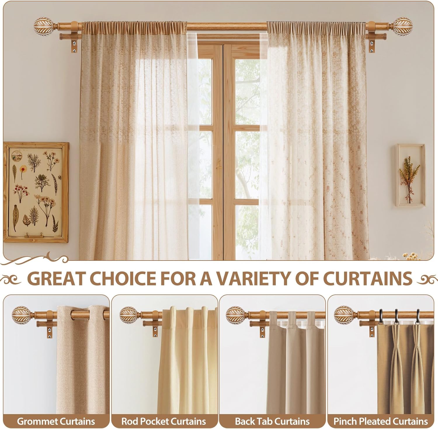 | Included Components | Includes 1 set of front rods (3 pieces), 1 set of back rods (3 pieces), 2 sets of finials in natural wood, and all necessary mounting hardware for quick installation. Instructions provided for hassle-free setup |