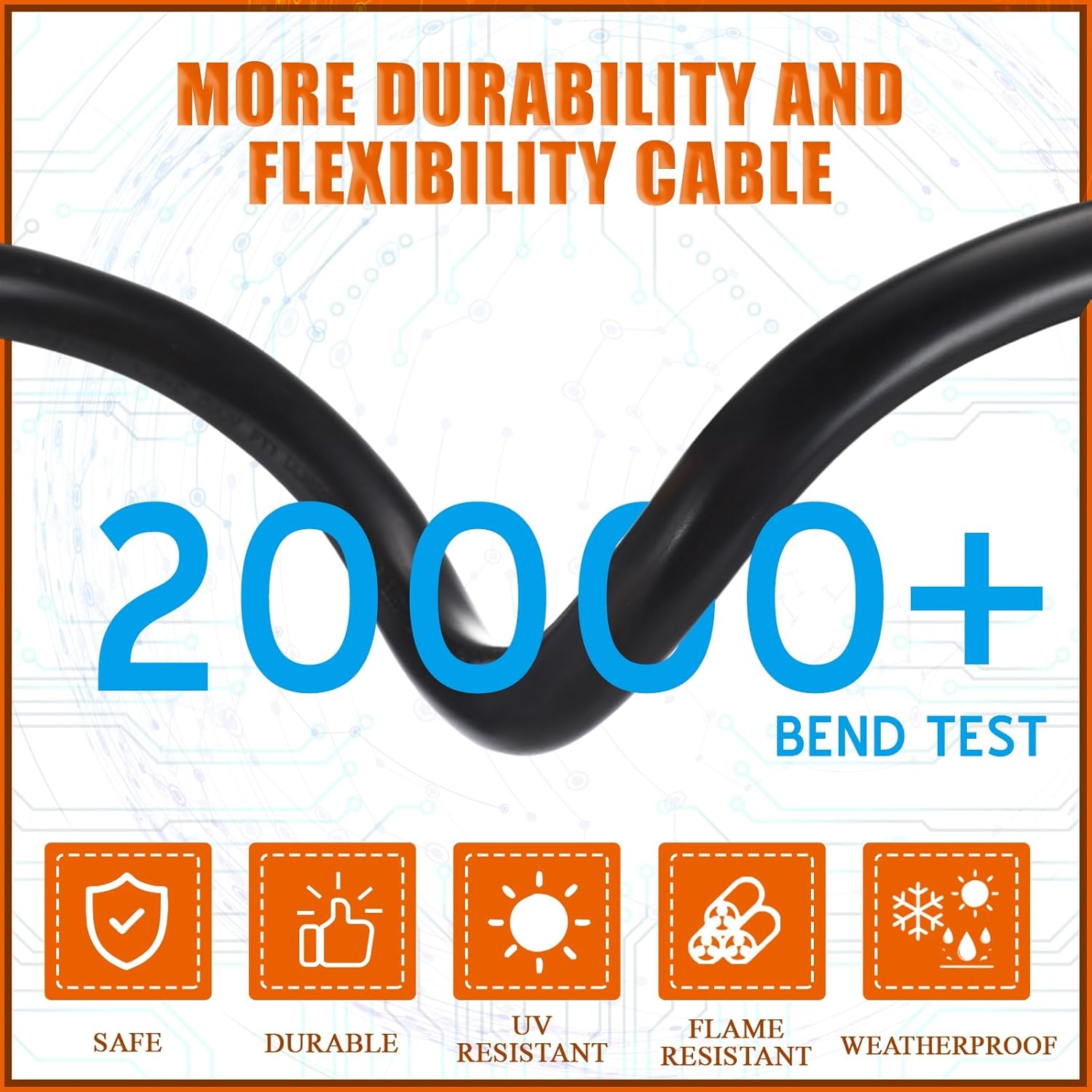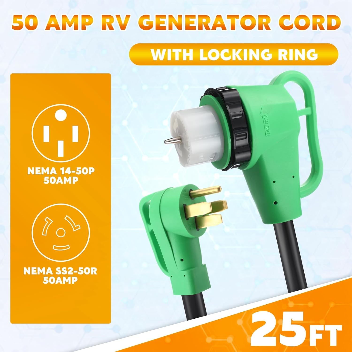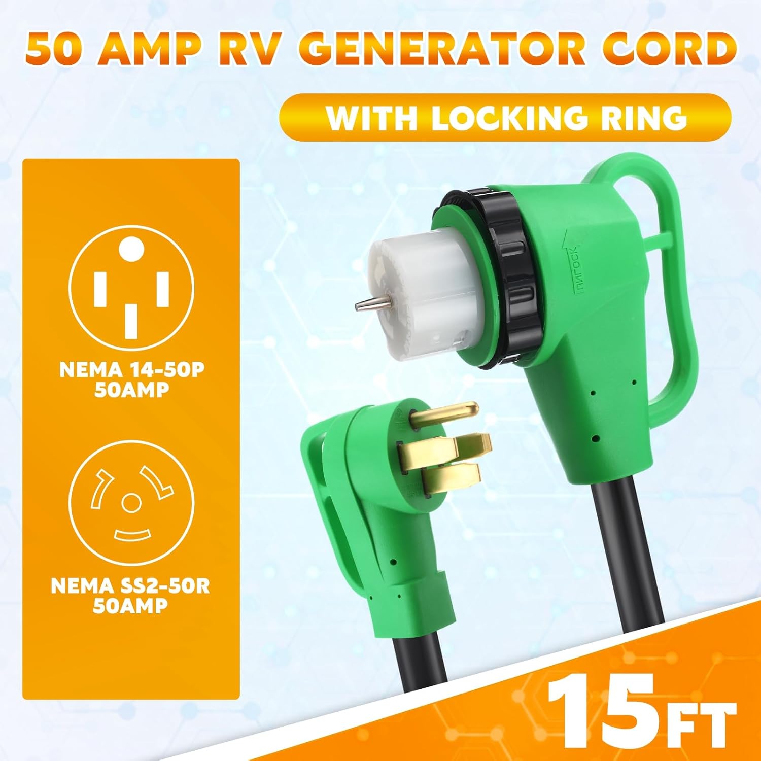 Features: Heavy-Duty Durability: Made from high-quality, rugged materials, this RV generator cord is built to withstand harsh weather conditions, including rain, snow, and extreme heat, ensuring it will last season after season, whether you're camping, tailgating, or on the road. Versatile Compatibility: This generator cord is compatible with most RV generators, delivering reliable and consistent power to your RV, camper, or trailer. The cord is equipped with standard NEMA 14-50P to 14-50R plugs, allowing you to connect seamlessly to a variety of power outlets. Convenient Length & Easy Storage: Available in multiple lengths, the RV generator cord gives you the flexibility to connect to your power source from a distance. When not in use, it coils neatly for compact storage, saving you valuable space in your RV or storage compartment. Specifications: Material: Copper, PVC Voltage: 125/250V Input Currents: 50 amps Cable length: 10 FT Notes: Manual measurement, please allow slight errors on size. The color may exist a slight difference due to different screen displays.