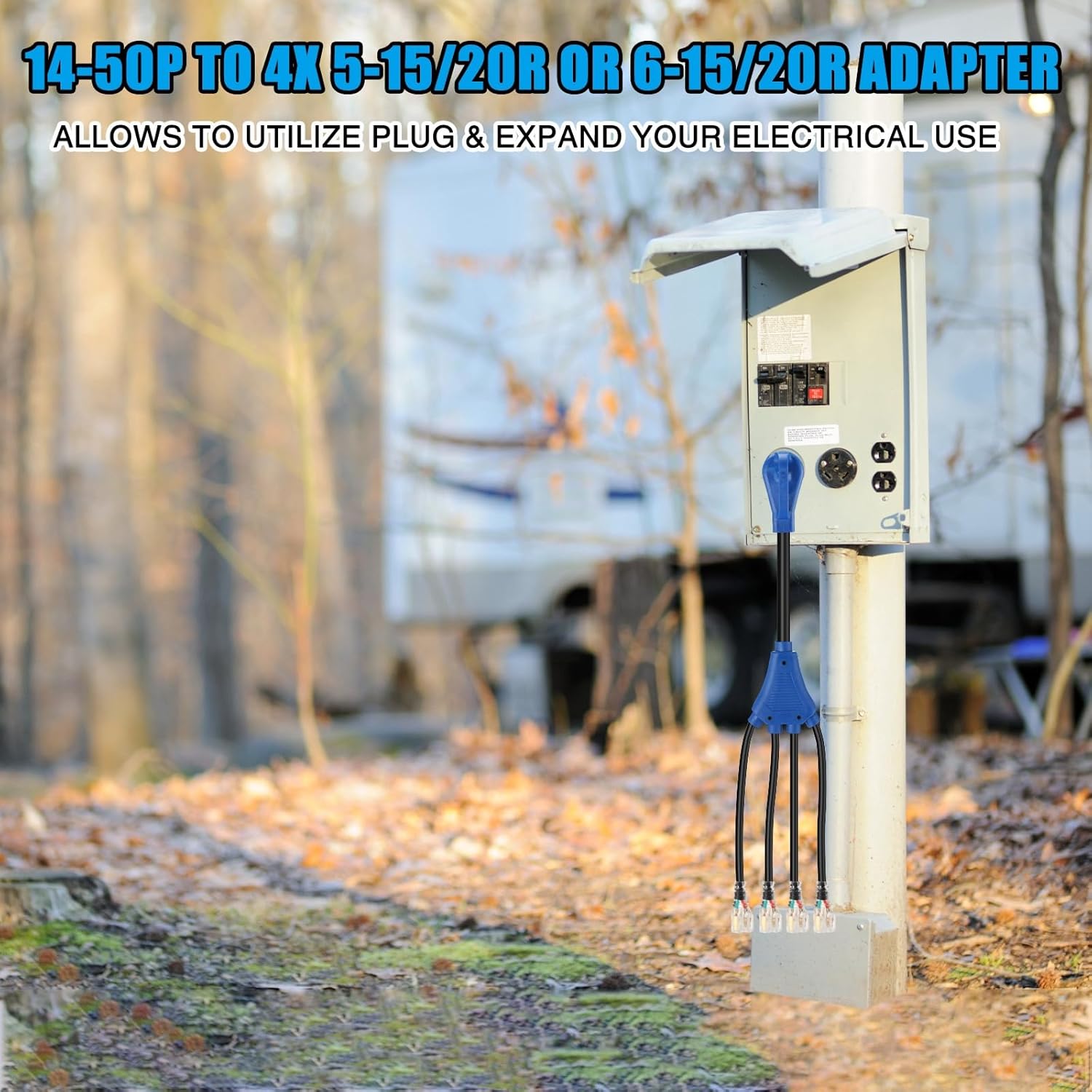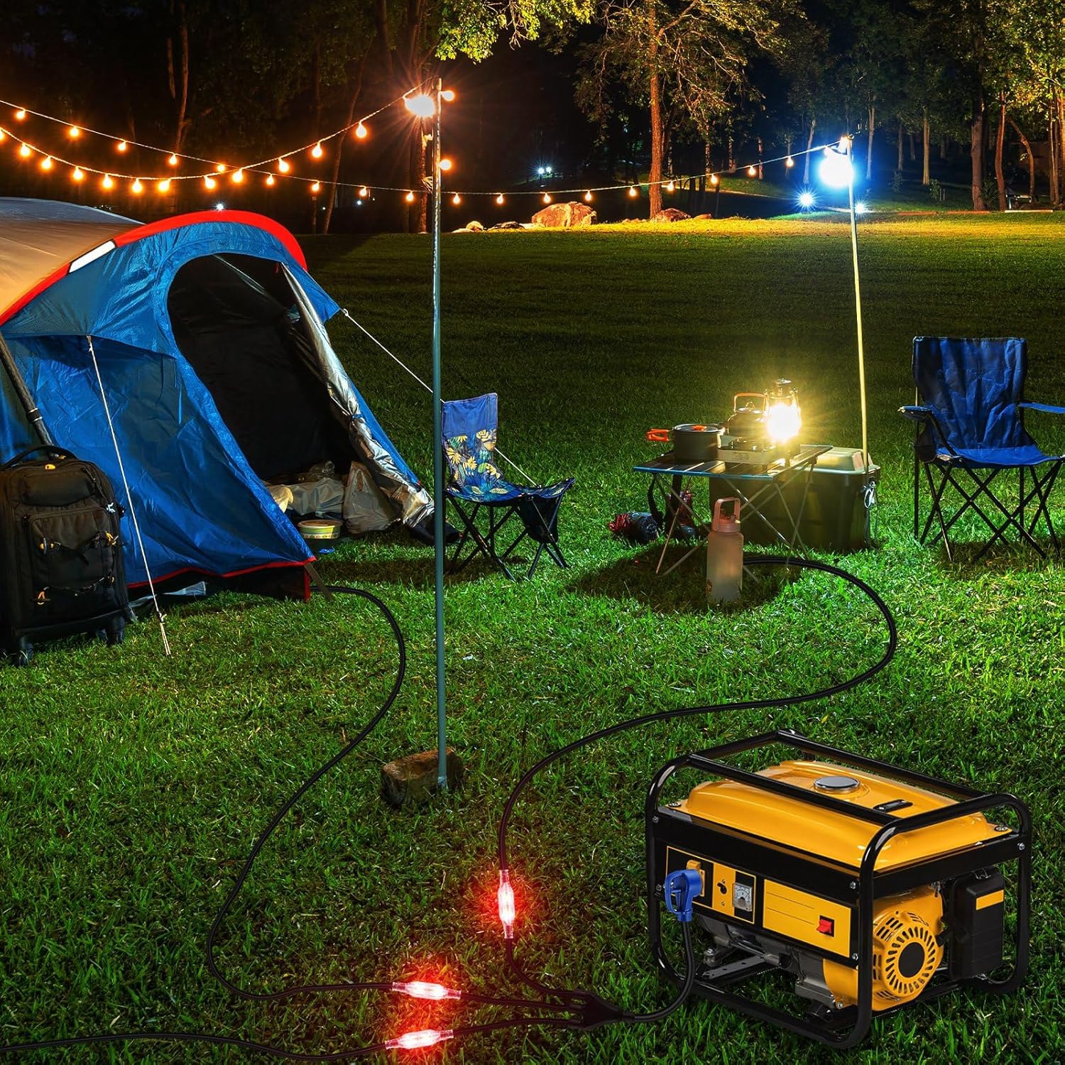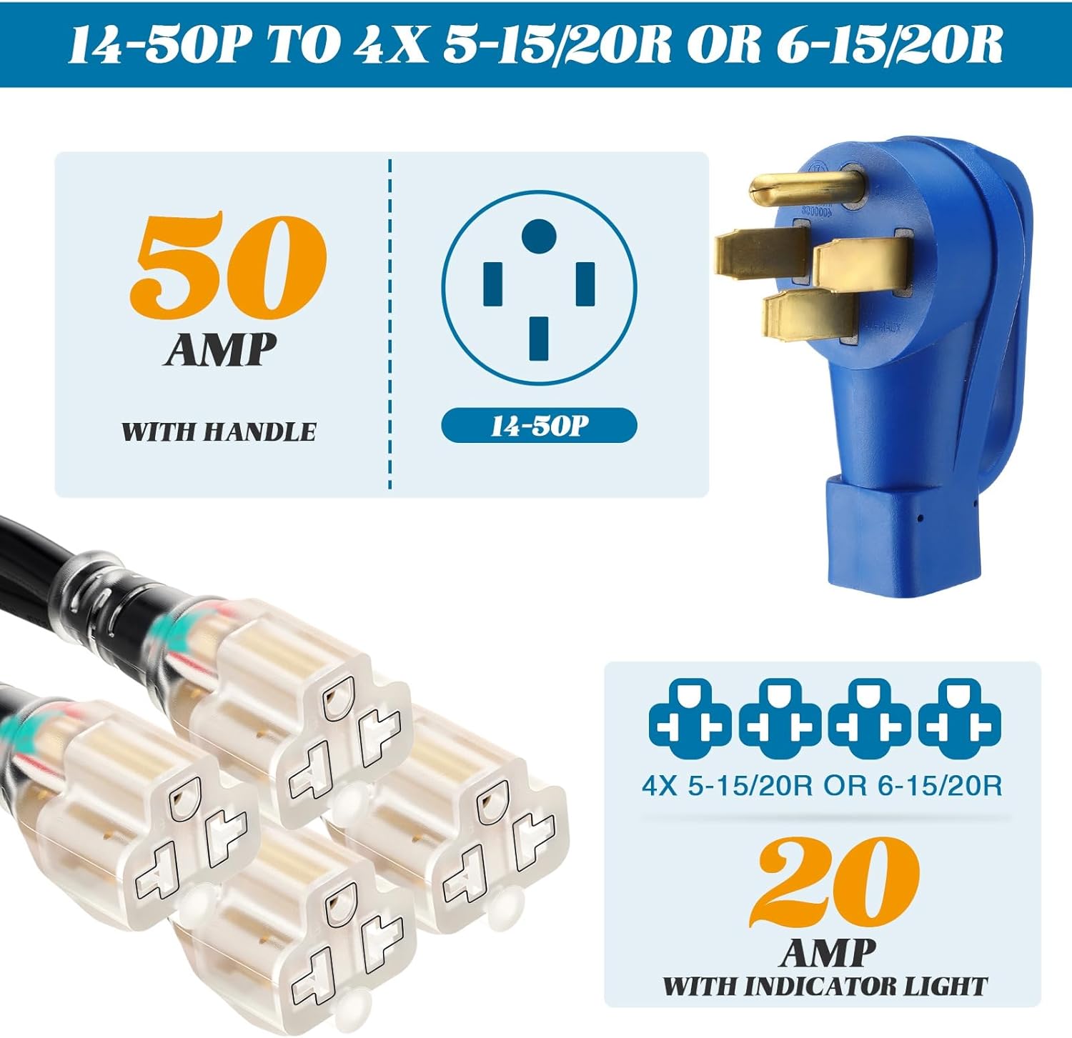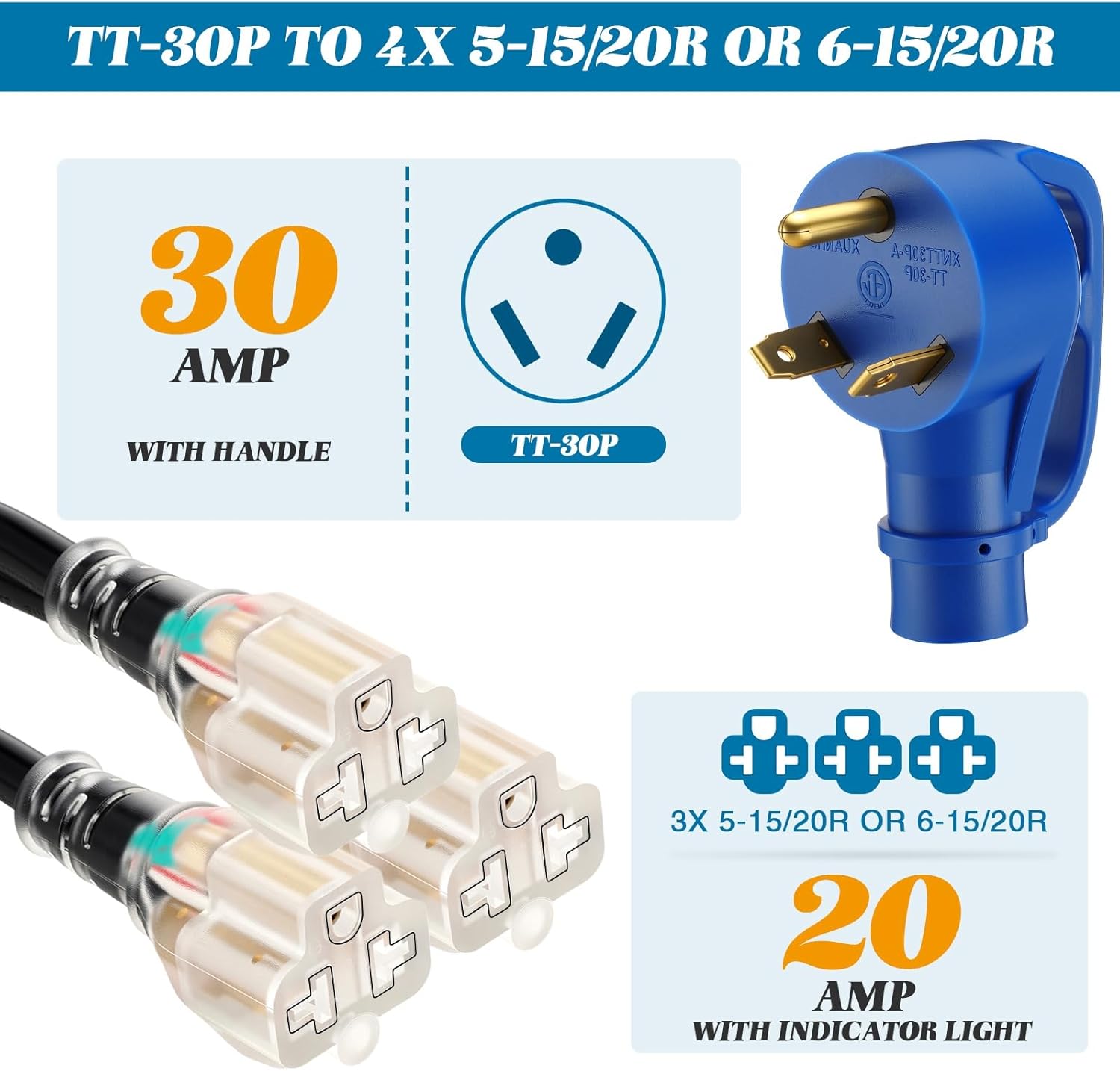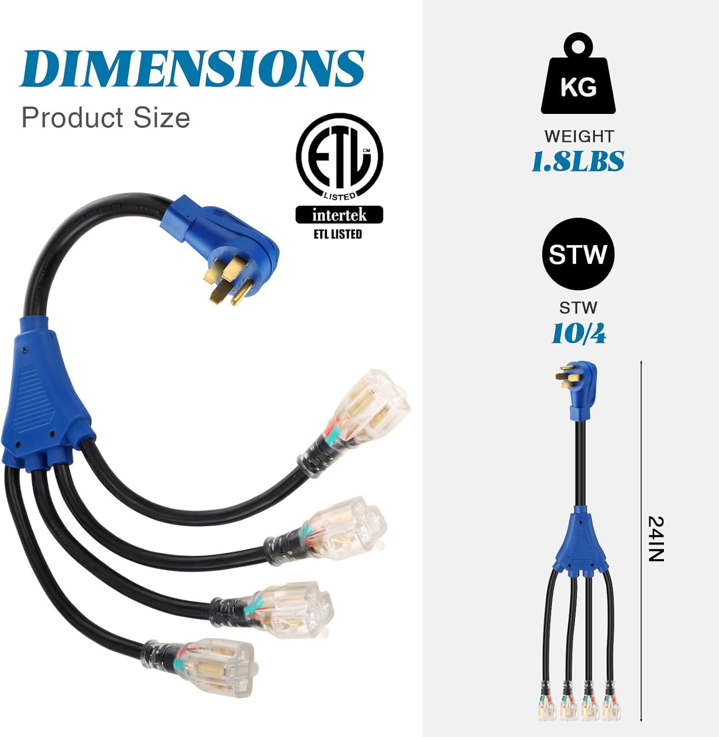Features: This heavy duty splitter features a 4 wire 10AWG main cord that draws full power from both hot lines, and distributes balanced 120V output through four 3 wire 12AWG branches. Ideal for safely powering multiple 15A or 20A appliances, tools, or equipment without overloading a single circuit. Compatible with all NEMA L14-30P generator outlets, it provides four 5-15R/5-20R outlets to support common 120V plugs found on portable air conditioners, treadmills, compressors, and more. Lighted outlets provide real time power status at a glance. Specifications: Material: copper wiring coating, flame retardant and UV resistant materials Color: blue plug and black cord Package includes: 1 x RV generator adapter cord Notes: Manual measurement, please allow slight errors on size. The color may exist a slight difference due to different screen displays.