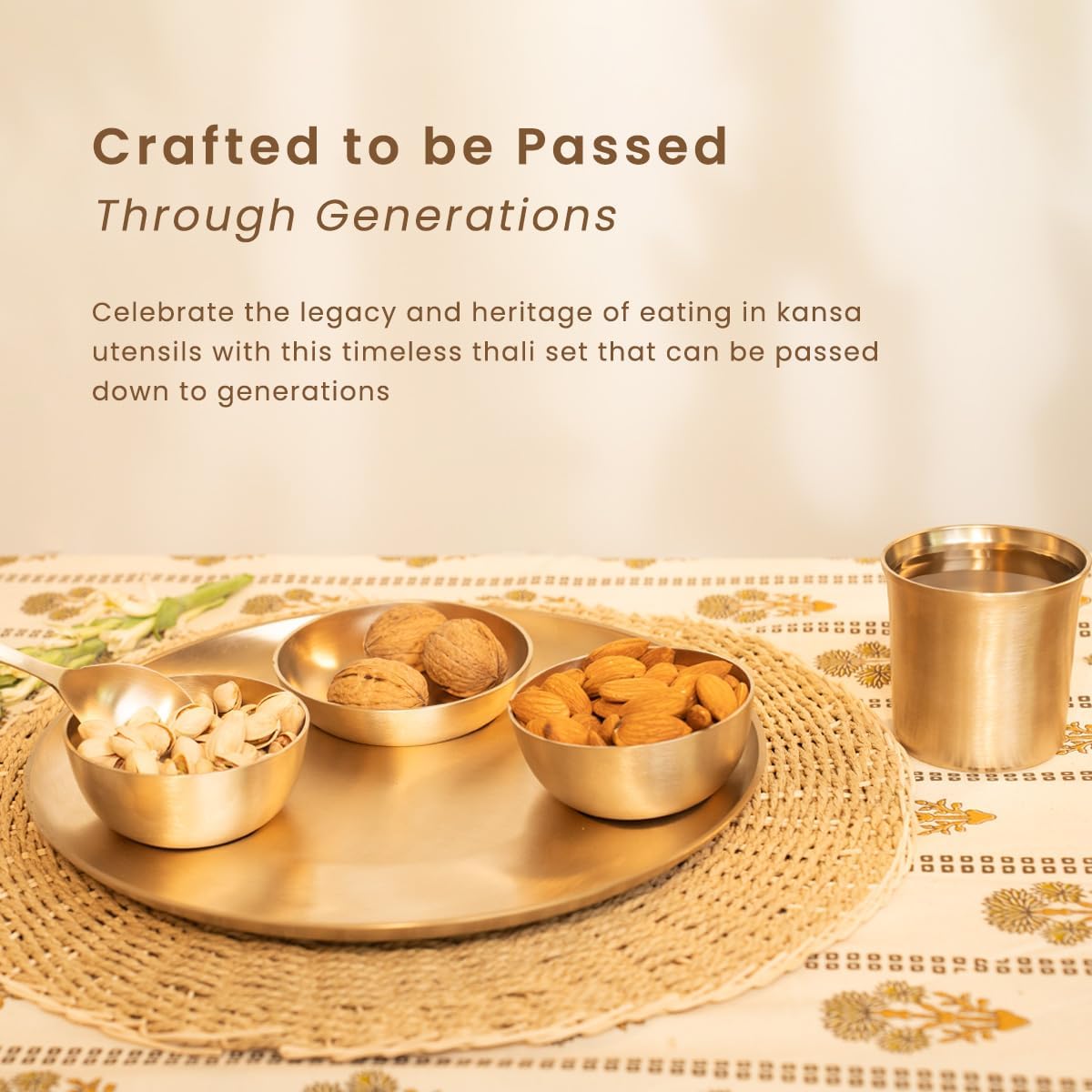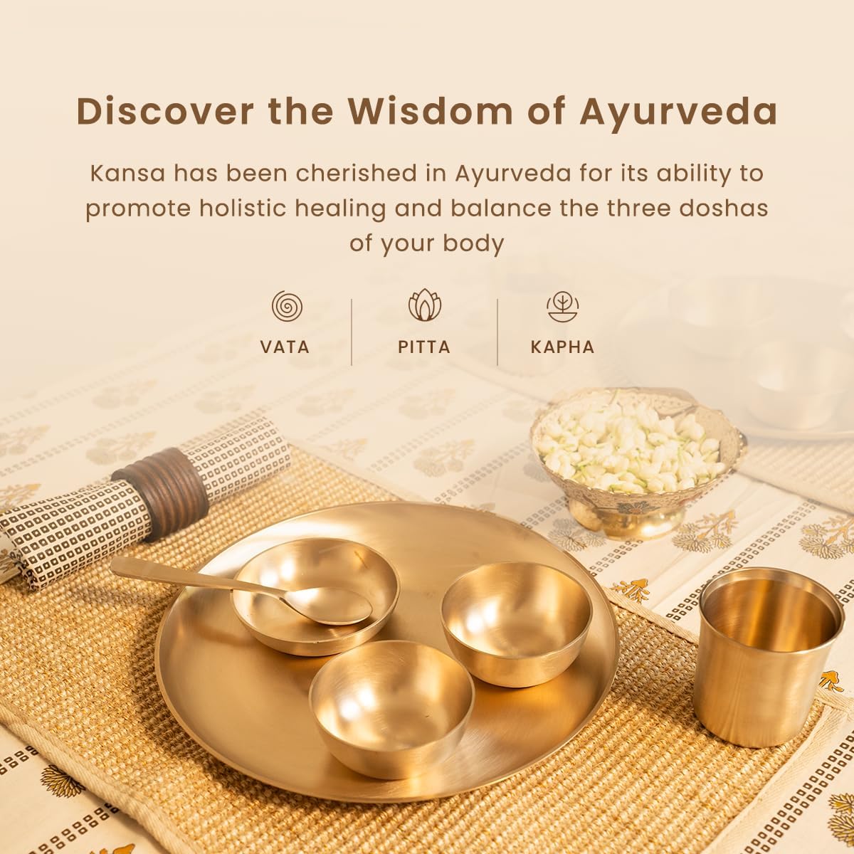 The Kansa Thali set by Earth Chakra is handcrafted and designed to elevate your dining experience. Kansa is celebrated in Ayurveda for its unique properties and is known for its ability to balance the Vata, Pitta, and Kapha doshas, as well as promoting your holistic well-being. Using utensils made of Kansa or simply a kansa dinner set to eat enhances the dining experience by balancing these essential energies, contributing to your overall wellness. The kansa thali traditional dinner set combines heritage design with modern functionality. Each piece is crafted from bronze, offering strength, longevity, and a touch of cultural tradition. The six-piece kansa set includes everything needed for complete dining: a thali, bowls, dessert bowl, spoon, and tumbler. Its thoughtful composition makes it practical for full meals. The polished bronze finish enhances dining tables with elegance. It not only adds visual charm but also connects everyday meals with traditional Indian practices. The versatility of the kansa thali set makes it useful for daily dining and also for religious or festive occasions, where traditional dinnerware is often preferred. The kansa dinnerware gift set is appreciated as a wedding, anniversary, or festive present. It represents both functionality and heritage, making it a lasting addition to households.