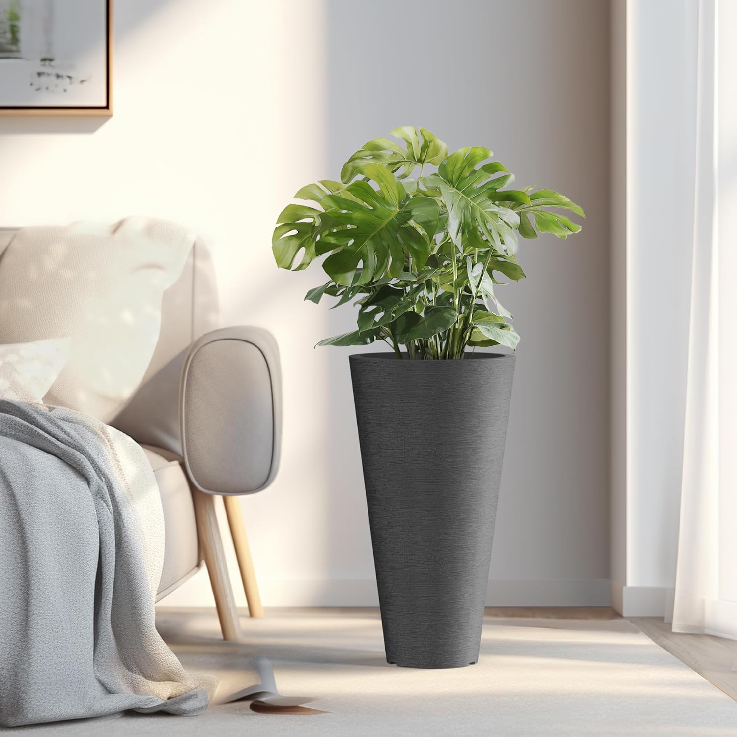 Kante Tall Round Planter Set of 2, 23" H Large Decorative Planter Pots for Outdoor Indoor Garden Patio Front Porch (Black)Premium Tall Planters - Meticulously crafted with durable construction and superior workmanship, our planters are made from high-quality plastic, ensuring longevity, weather-resistance, and color retention. Whether utilized indoors or outdoors, these tall round planters are suitable for all seasons.Spacious & Versatile - Our planter boasts ample capacity, fostering optimal plant growth and development. Whether planting directly inside the planter or using potted plants, its generous space accommodates both. Moreover, the integrated handle facilitates effortless removal of the inner planter, ensuring convenient plant maintenance.Minimalist Chic - Elevate your space with these tall and wide planters, embodying sleek lines and a contemporary black finish—a defining trend in modern landscape design. The textured surface introduces an artistic touch to your garden, patio, office, living room, or front door area.Built-In Drainage System - The inner pot of our planter incorporates 48 drainage holes, facilitating the efficient removal of excess water. This design enables proper moisture absorption from a water tank into the substrate, ensuring optimal soil moisture and oxygen levels. This fosters the healthy growth of plants and trees.Guaranteed Satisfaction - Our dedication to exceptional customer service ensures that if you're dissatisfied, we'll promptly provide a full refund or a replacement product, ensuring your complete satisfaction.