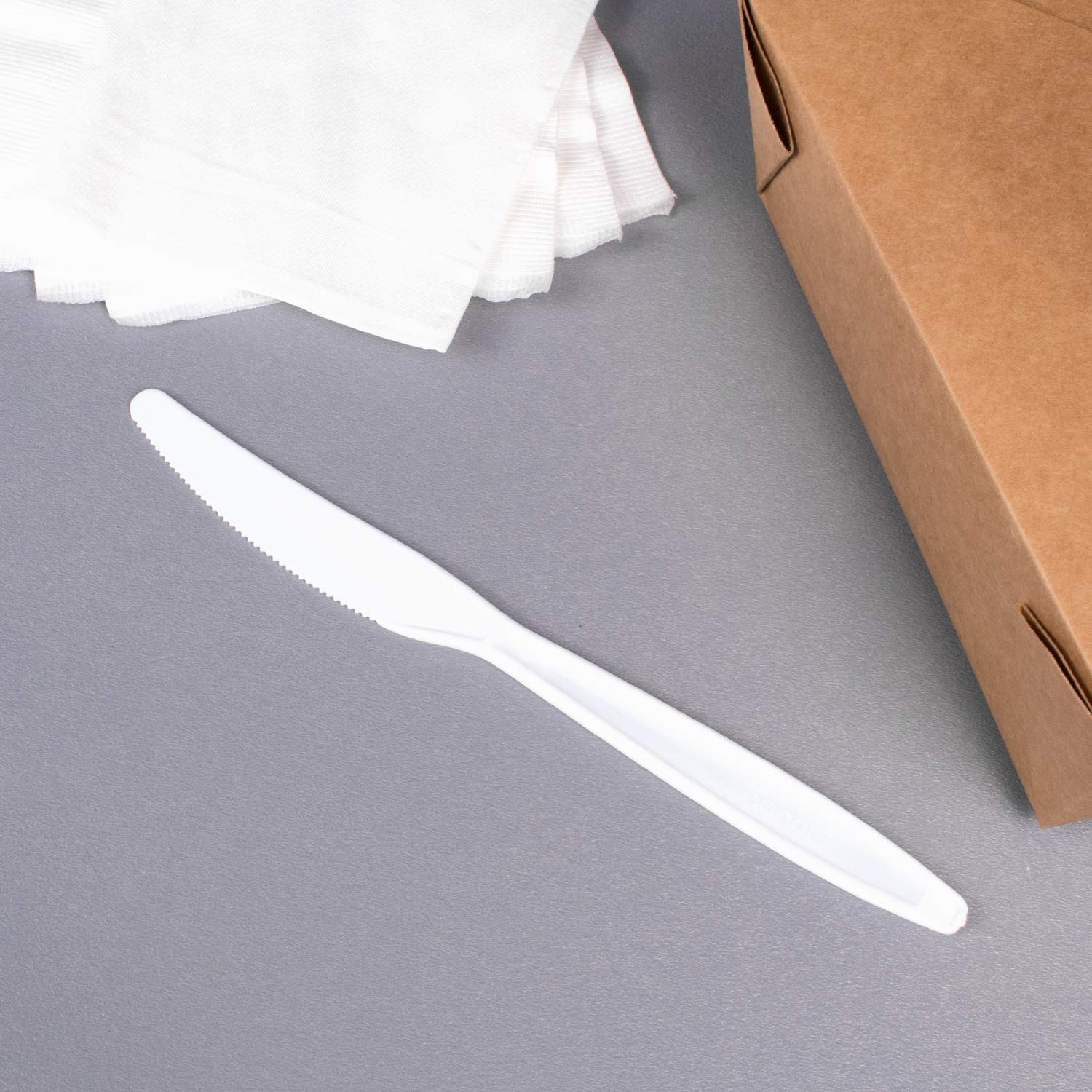 Karat PS Heavy Weight Knives - White - Wrapped Karat heavy-weight knives are ideal concession stands, cafes, or break rooms. Sold as a bulk box, containing one bag of 1, 000 knives, individually wrapped for sanitary handling. These knives are 7. 6” long . White color, made from heavy-weight polystyrene. A cost-effective solution for any take-out business.