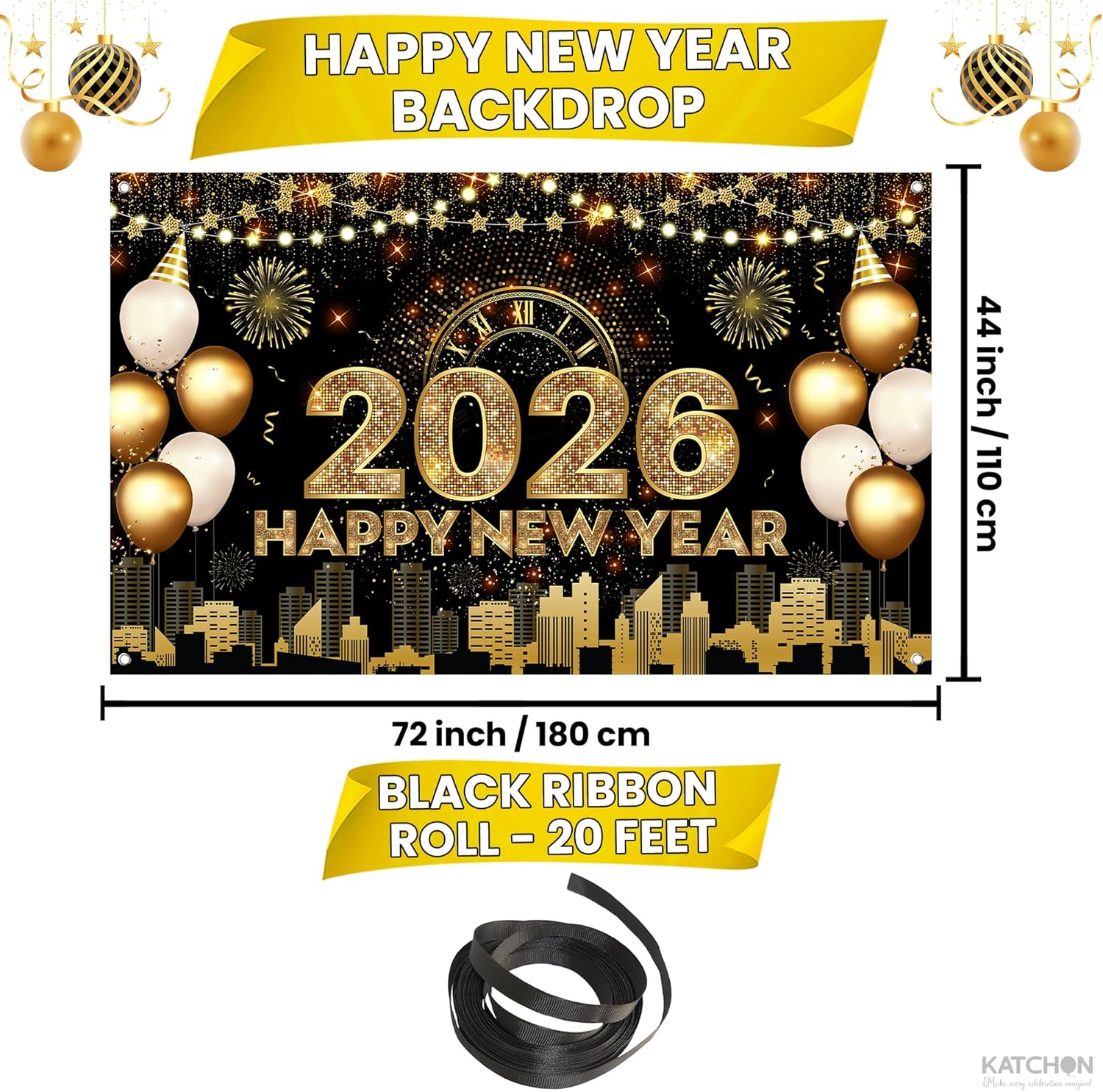 What You’ll Get 1 × XtraLarge Gold Happy New Year Banner (72×44 inches): Perfect as a wall backdrop, dessert table display, or NYE photo booth background. 1 × XtraLarge Gold Happy New Year Yard Banner (120×20 inches): Ideal for outdoor lawns, porches, fences, and party entrances to welcome guests in style.
