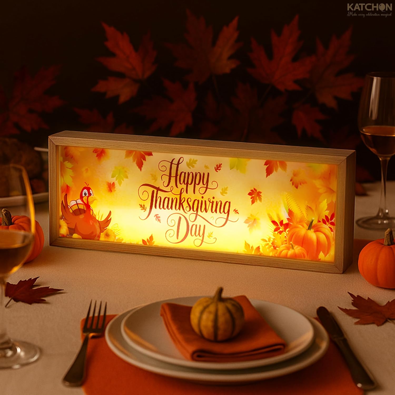Happy Thanksgiving Centerpiece – Pack of 1 | Light Wood Table Lamp for Thanksgiving Table Decor | Turkey Decorations for Thanksgiving & Home Decorations What's Included: Perfect Size: Measures 12 x 4 x 2 inches, making it an ideal centerpiece for dining tables, mantels, shelves, or entryways. High-Quality Build: Crafted with a durable wooden frame for a rustic and elegant holiday touch. Layered Design: Features 3 acrylic sheets that create a vibrant, dimensional effect with pumpkins, fall leaves, and a festive turkey. Warm LED Glow: Soft lighting beautifully highlights the “Happy Thanksgiving Day” message, adding cozy seasonal ambiance. USB Powered: Easy to use, energy-efficient, and convenient for long-lasting illumination. Reusable Décor: Built to last and designed for use year after year, making it a timeless addition to your Thanksgiving decorations. Single-Piece Pack: Comes as one ready-to-display LED light centerpiece for effortless seasonal decorating. Adjustable Brightness: Choose from low, medium, or high brightness to suit your mood or setting. Easy Control: Simple remote-style buttons (+ to increase brightness, – to decrease, and power button). Lighting Options: Turn off, set to low brightness for subtle ambiance, or high brightness for a bold festive gl Interchangeable Thanksgiving Welcome Door Sign | Fall Wreath Signs and 15 Changeable Icons | Housewarming Gifts | Seasonal Decor for Thanksgiving, Halloween, autumn, Christmas, Valentines What's Included: ✔️ 1 x Wooden Welcome Sign (30cm) with pre-attached hook ✔️ 4 x Seasonal Floral Bows: - Gingham Eucalyptus Bow (31x17cm) - Sunflower Spring Bow (28x15cm) - Autumn Fall Leaves Bow (25x16cm) - Red Berry Christmas Bow (31x17cm) ✔️ 21 x Magnetic Icons – covering all seasons and events such as Valentine’s Day, Easter, Summer, 4th of July, Halloween, Thanksgiving, Christmas, and more. Each magnet represents a specific season or celebration: heart for Valentine’s, pineapple for summer, pumpkin for Hallow