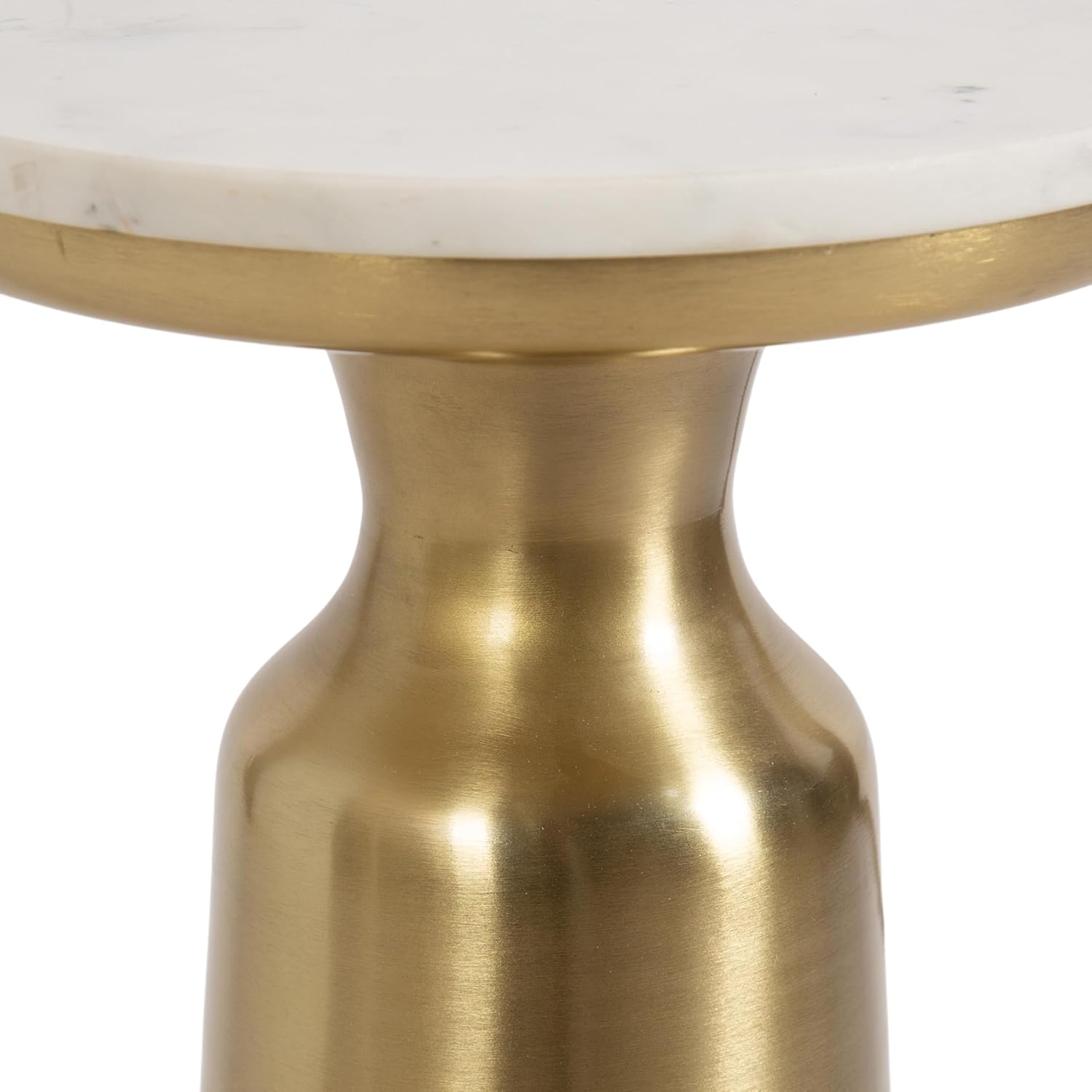 Introducing the Kate and Laurel Cardina round drink table, a captivating blend of modern glam and natural elegance. The striking combination of the white marble tabletop and the gold base creates a luxurious aesthetic that is sure to impress. The tabletop is crafted from authentic marble to create a modern aesthetic, while the base is crafted from sturdy iron. This charming cocktail table is a beautiful accent for serving and placing drinks when friends are around due to its sturdy metal base. Its versatile size and round design allow for easy placement and rearrangement to suit your needs. This exquisite circular mini table boasts dimensions of 10 inches in diameter by 22 inches high, making it the perfect addition to your living room, bedroom, or any space in need of a stylish accent piece. Whether you place it next to your sofa, by your bedside, or in a cozy reading nook, this versatile drink table effortlessly enhances any space. The circular shape promotes a harmonious flow. It also offers ample surface area for holding drinks, snacks, or a good book within arm's reach.