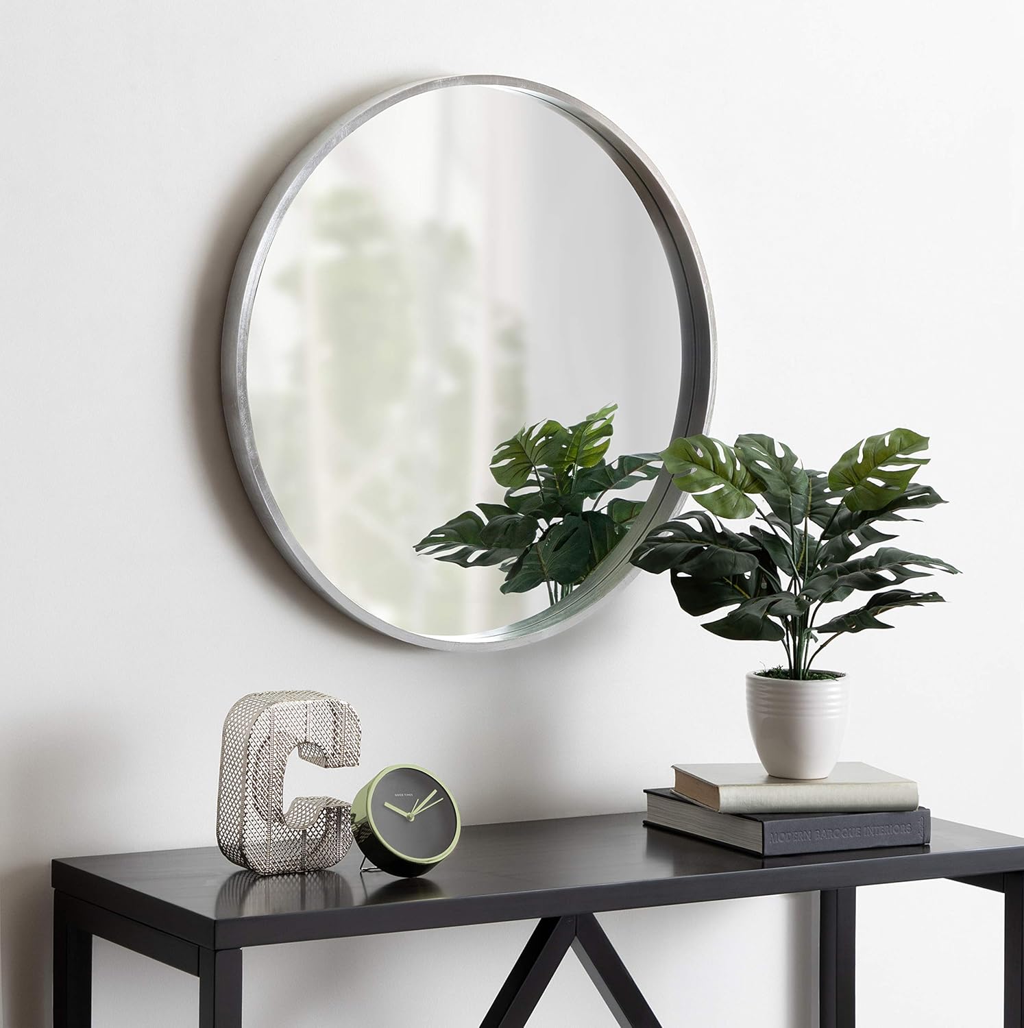 This decorative round wood mirror is a beautifully unique accent piece for your home decor. Hang this mirror above a fireplace, over a sofa, or above your bedroom headboard for a stunning wall accent. This mirror is also a wonderful vanity mirror. The reflective mirror surface has a 24.5 inch diameter. The outer dimensions measure 25.6 inches diameter and 1.25 inch depth from the wall. The mirror weighs 8 pounds. Two metal d-ring hangers are attached to the back of the frame for easy wall display. This gorgeous wood contemporary modern wall mirror piece will be the perfect fit in your existing decor theme in any room of the home!