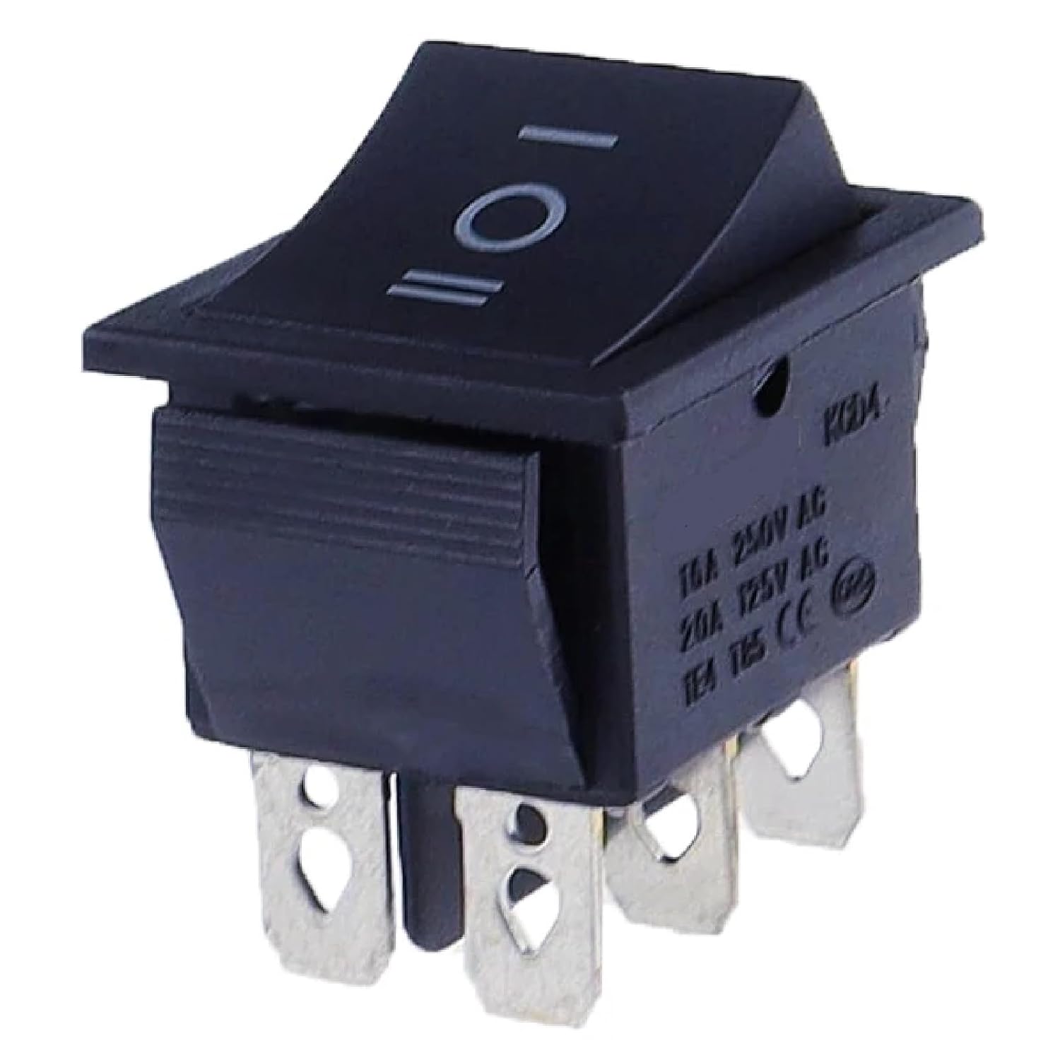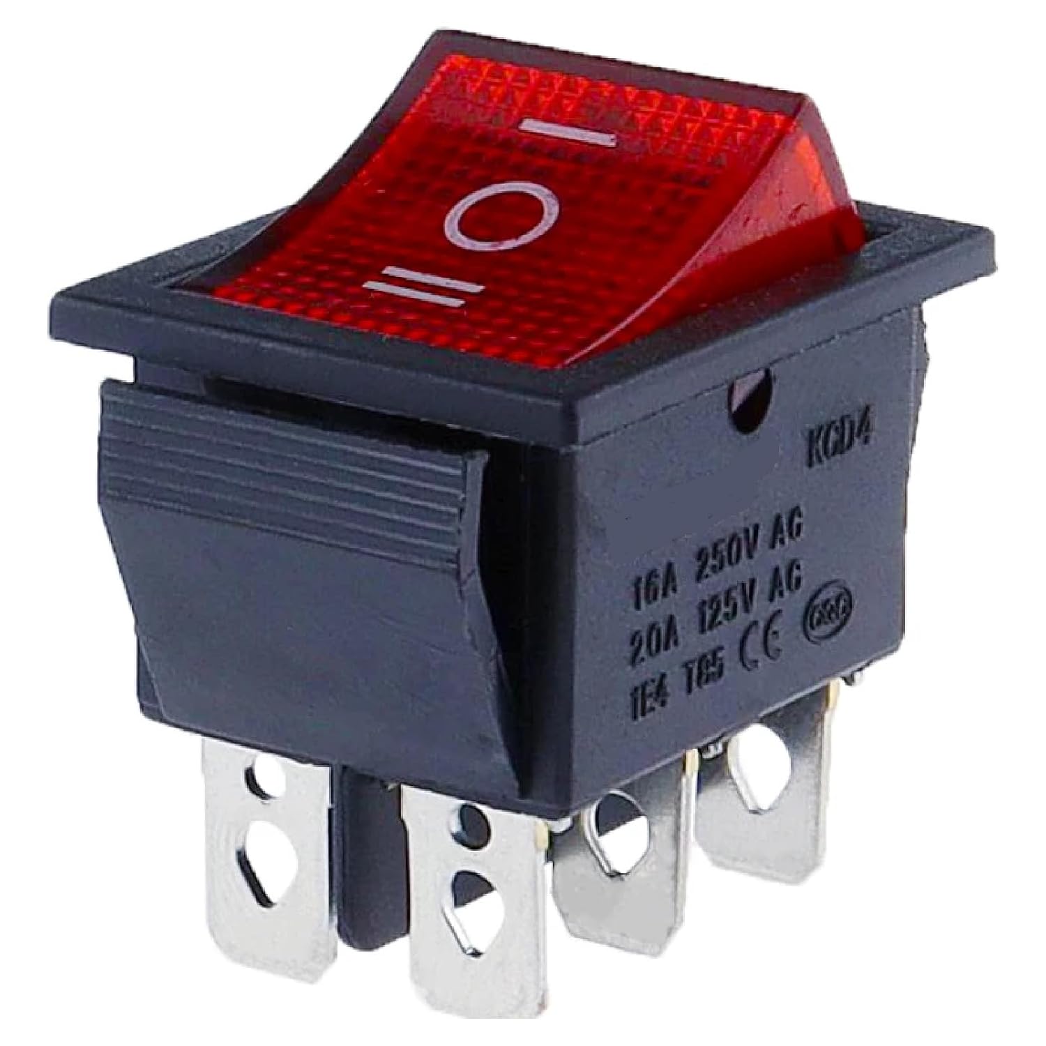 This versatile KCD4 rocker switch offers reliable three-position (ON-OFF-ON) functionality for a wide range of electrical equipment applications. Built to handle demanding power requirements of up to 16A at 250VAC or 20A at 125VAC, this heavy-duty switch features a convenient illuminated design that makes it easy to locate and check switch status in low-light conditions. The 6-pin configuration provides flexible circuit control options, while the durable plastic housing ensures consistent performance through repeated use. The switch's robust construction makes it ideal for various electrical applications where dependable power control is essential. Perfect for both professional and DIY electrical projects, this rocker switch combines practical functionality with user-friendly operation. Its compact design allows for easy integration into new installations or as a replacement component. The illuminated indicator serves as a clear visual reference for the switch position, enhancing operational safety and convenience.