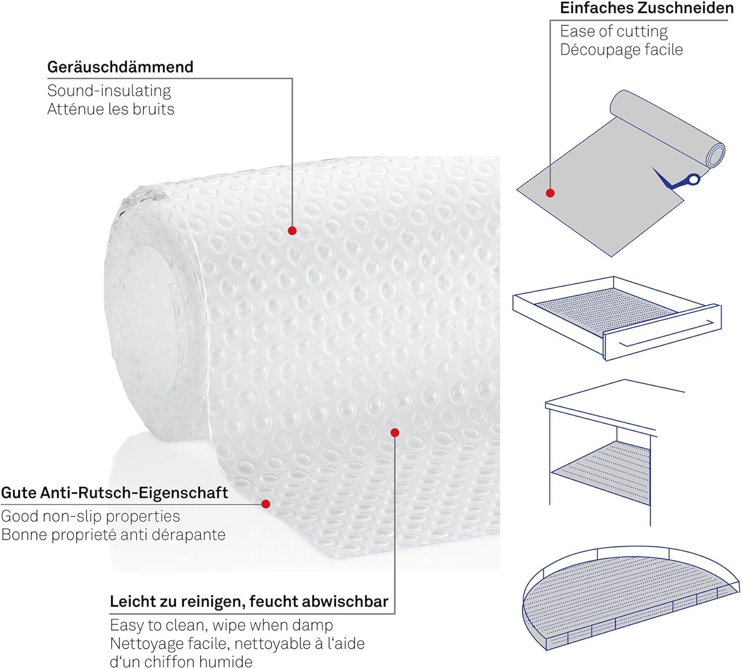 Für die Schublade, das Küchenregal oder die Vorratskammer: Flexible Schubladenmatte zur Vermeidung des Verrutschens von Küchenhelfern und anderen Gegenständen Geräuschdämpfend, Schutz vor Kratzern Flexibler Einsatz: Individueller Zuschnitt, Auch für runde Bereiche Einfache Reinigung: Mit feuchtem Tuch Lieferumfang: 1 x Kela Schubladenmatte, Soletta, 390166, Individueller Zuschnitt, 150 x 50 cm, Transparent