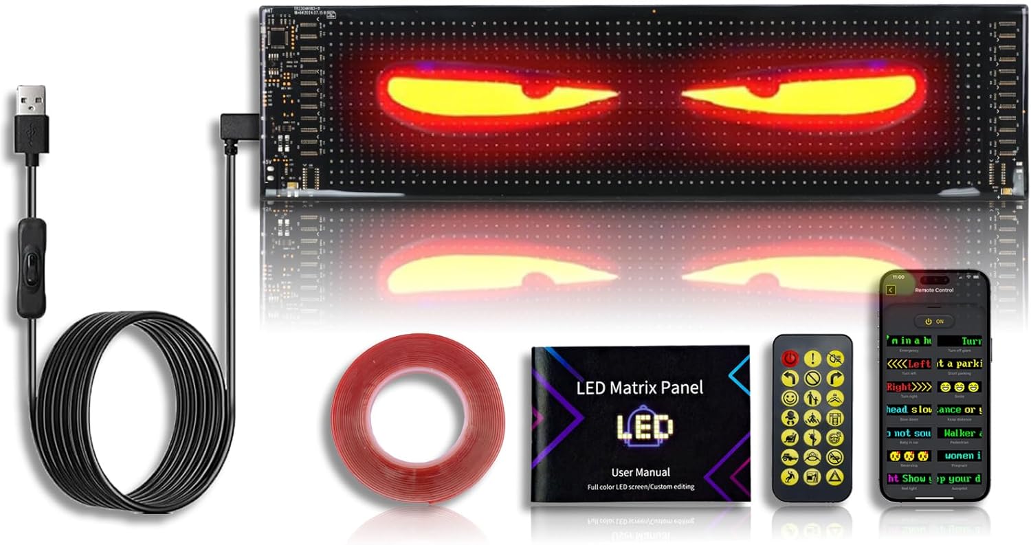 Kefly Programmable LED Sign for Car, Devil Eyes Light for Windshield, Flexible LED Matrix Panel, Bluetooth APP Control, Also a Smart Clock (7.5"x35.3")