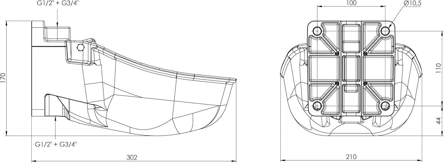 Drinking Trough K50 ; drinking trough made from high-quality plastic Capacity: 2.2 L ; tongue can be shut off (separate accessories) Water connection at the top or bottom' Suitable for 1/2 "and 3/4 inch drive , water flow rate: Adjustable into 3 different positions; Approx. 7.5 – 11 L/min at 3 bar Suitable for fixing to walls and pipes Surface mounting bracket and stabilising plates are not included in the box contents – Weight: 0.95 kg/2.1 lbs