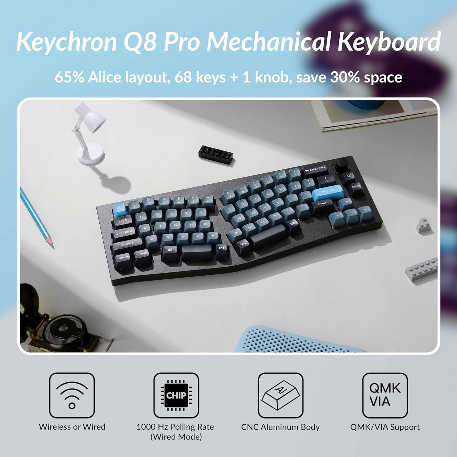 Meet the Keychron Q8 Pro, the full-metal QMK wireless custom mechanical keyboard with a 65% Alice layout, along with many premium designs, including double-gasket design, PBT keycaps, screw-in stabs, etc., it will deliver you an unprecedentedly ergonomic typing experience!