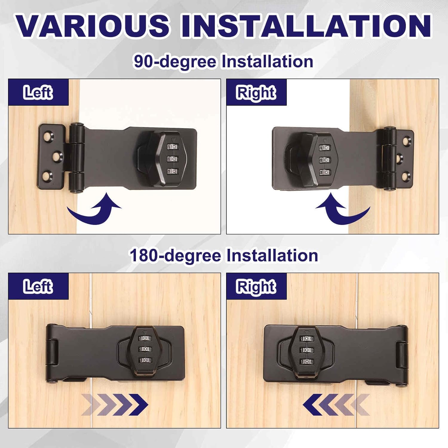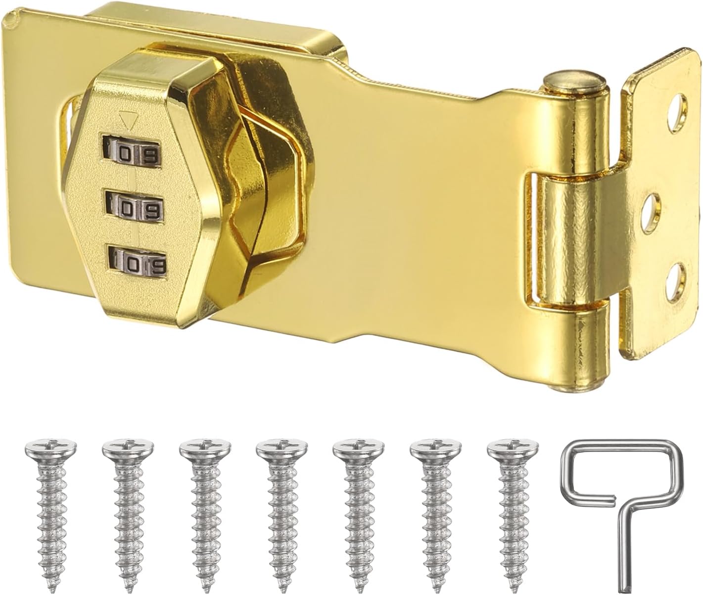 [Safe Durable]The Password Hasp Latch Lock is made of premium zinc alloy and alloy steel, making it thicker, stronger, and more durable to effectively resist daily wear and tear, corrosion, and forced break-ins. The electroplated coating effectively prevents oxygen from the air, preventing rust and corrosion.[Wide Application]This rotary password lock is universally suitable for a variety of indoor and outdoor storage solutions. Suitable for gate, shed doors, barn doors, gardens, patios, pet doors, cabinets, drawers, mailboxes, safes, office filing cabinet locks, and more.[Easy to Install Use]The installation is straightforward. Mark the desired installation location, and drive the screws into the hasp, then screw the knob base.[Designed for Convenience]The Mechanical Password Rotary Hasp features a keyless cabinet lock design. Set a 3-digit combination for quick and easy opening, eliminating the worry of losing your key. 1,000 combinations are available to ensure the safety of your valuables.[Usage Tips]The initial password is 000. To change the password: 1. Unlock; 2. Use a pin to the hole to change the password; 3. Release the hole after changing the number - the change is successful.