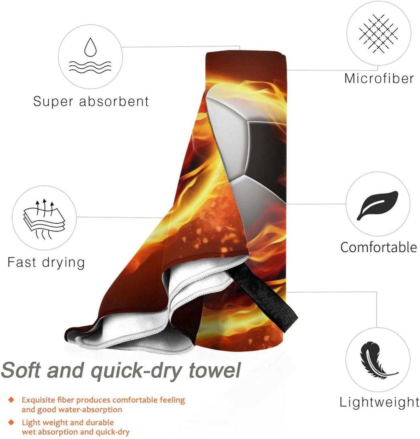 designSoccer flame compact towel for camping are designed with one-sided printing. The towels are equipped with special packaging bags and carabiners, which are convenient for packaging and hanging, and can be hung anywhere to dry quicklymaterialcompact towels for swimming is made of microfiber, which is more absorbent than standard towels, dries quickly, is lightweight, and small enough to easily fit the towel into a gym bag or backpackscene cotton towel for beach carabiner on the bag, can be attached or packed into your bag, the beach towel can also be used as a sports towel, travel towel, yoga towel or used as a beach, bathing, swimming pool, swimming, boating, sunbathing, mats for spa, sauna, water park, climbing, fitness, yoga, travel, camping, hiking, picnic, travel, outdoor and sports, etccomponentbeach blanket for swimming have buckle webbing, easy to hang and air dry, pvc packaging bag, equipped with a carabiner, easy to store and carrywashinglightweight towel for swimming machine washable, wash before first use, just hand wash or machine wash, air dry