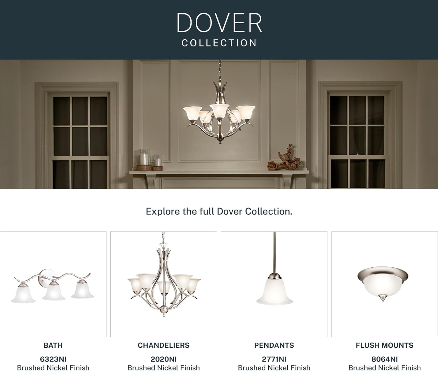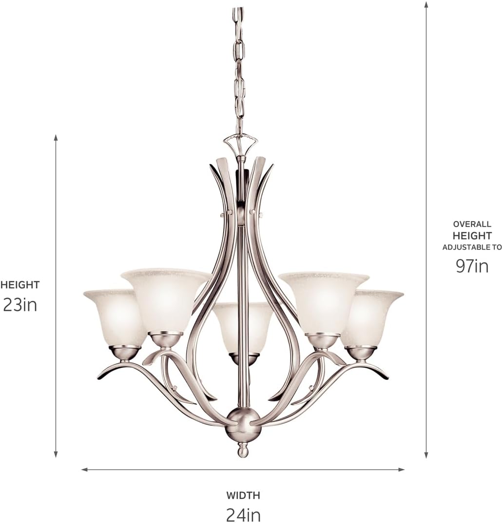 Product Description The Dover 23" 5 light chandelier features a transitional look with gentle curves and etched seeded glass and Brushed Nickel finish. The Dover chandelier is perfect in several aesthetic environments including transitional and traditional. From the Manufacturer Finish: Brushed Nickel, Light Bulb:(5)60w B10 Cand F Incand The Dover Collection takes classic design and offers its own unique, modern twist. Characterized by its long, sweeping arms, Dover fixtures offer a clean look while remaining fresh and exciting. With its hand-wrought steel frame, you can be sure of a high quality fit and finish that is second to none. Includes 49' extra lead wire and 72' chain.