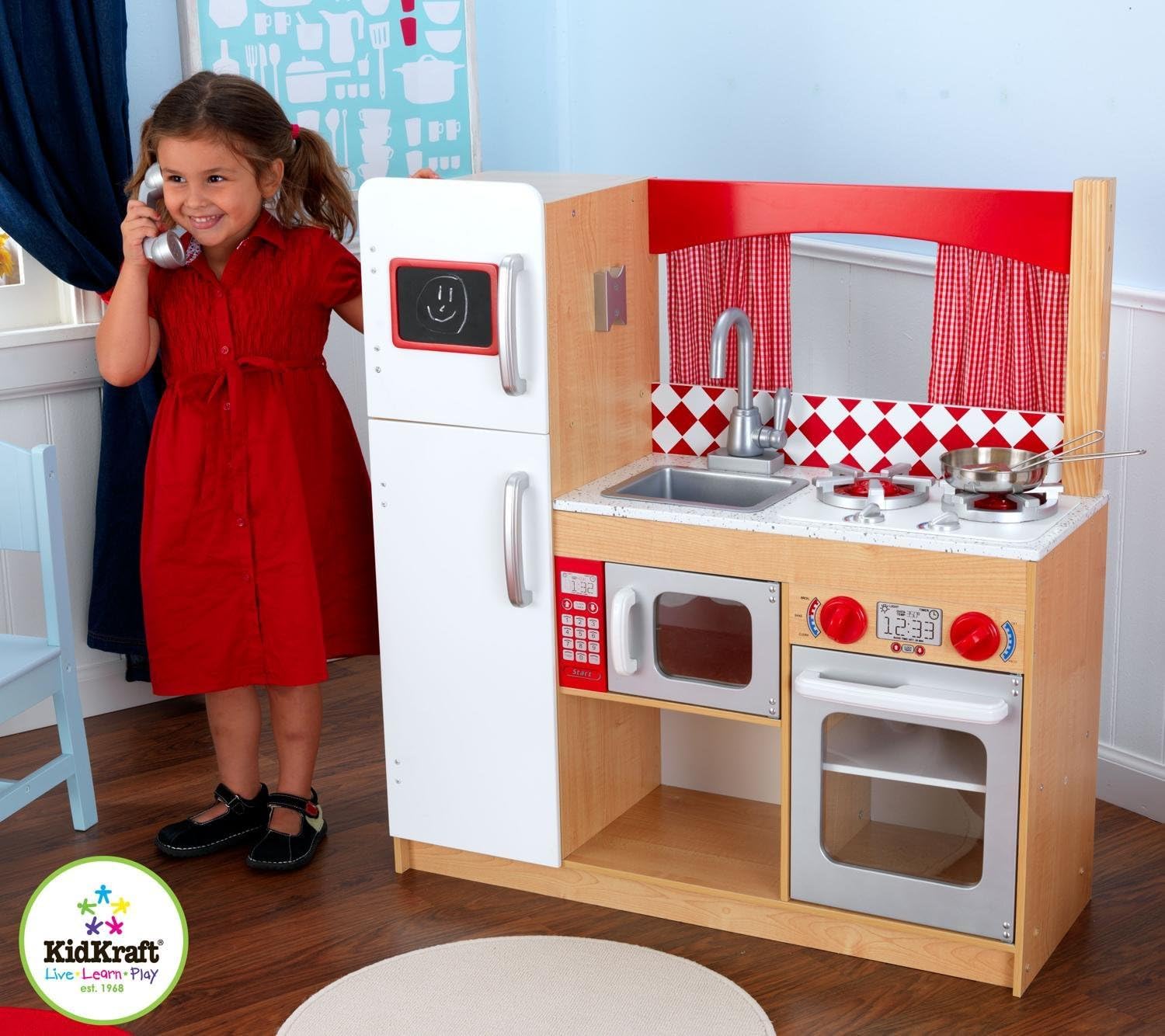 Amazon.com Let your child's imagination soar with the KidKraft Suite Elite Kitchen, an Amazon Exclusive item. This kid-sized kitchen has all the features of a real kitchen to stimulate culinary creativity and inspire fun, creative play. These features include a two-burner stove, refrigerator/freezer, sink, microwave, and curtains, all of which are embellished with bright colors and detailed graphics to enhance the realistic look and feel of the kitchen. Intended for use by children 3 years of age and older.Suite Elite Kitchen Ages: 3 years and up Requires: Phillips screwdrivers; Adult assembly What We Think Fun factor: Durability: Ease of assembly: Educational factor: Novelty factor: The Good: Functional details create a life-like kitchen experience The Challenging: Time-intensive assembly In a Nutshell: A stimulating kitchen that encourages creative play and inspires the development of a healthy imagination This durable, kid-sized kitchen stimulates your child's culinary creativity. View larger. A Recipe for Creativity The KidKraft Suite Elite Kitchen combines engineering and durability with bright colors and fun details to provide a holistically creative experience for your child. Features include a two-burner stove with dials that turn, an oven with moveable dials and a viewing window, a microwave with a window in the door, a sink with adjustable faucet and moveable handle, and real cloth curtains that can be pulled open or closed. The refrigerator/freezer unit features a real chalkboard on the door and a wall-mounted jack for the cordless telephone handset. An open storage shelf beneath the microwave provides ample space for KidKraft cooking accessories (not included), and the roomy refrigerator interior will easily hold all the Tasty Treats Pretend Food (not included) your young chef needs to get the most out of this stimulating kitchen. Handcrafted wood pieces and plastic components have been tested against mechanical and/or material hazards and are engineered to last, providing years of playtime for the little chef in your home.The Proof is in the Pudding The KidKraft Suite Elite Kitchen will endure the test of time. Built to last by a company founded by engineers, the vivid graphics and life-like details of the KidKraft Suite Elite Kitchen encourage lively, imaginative play. All components of this stimulating kitchen have undergone rigorous testing to guard against any mechanical and/or material hazards and can be easily cleaned with soap and water. Considerable time should be set aside for adult assembly of this kitchen. With over 35 individual parts and corresponding hardware, a power Phillips screwdriver is recommended to save time. Once assembled, adult supervision is recommended to ensure that children do not climb on or around the kitchen. In addition, a separate wall-mounting kit (not included) is available for attaching the kitchen to a wall for increased stability.What's in the Box Wood and plastic play pieces and panels, hardware for assembly, two cloth curtains, and instructions for assembly. From the Manufacturer An adorable blast from the past, Kidkraft’s Suite Elite Kitchen has the throw-back appeal of a drive-in diner from the 50’s. Kiddos can cook and entertain while enjoying cute granite-like countertops, order-up gingham curtains and a retro-looking diamond backsplash.  Raised burners, a microwave and large oven make for wonderful culinary role-play, and a real chalkboard is perfectly placed for menu-posting or taking to-go orders with the kitchen’s telephone.