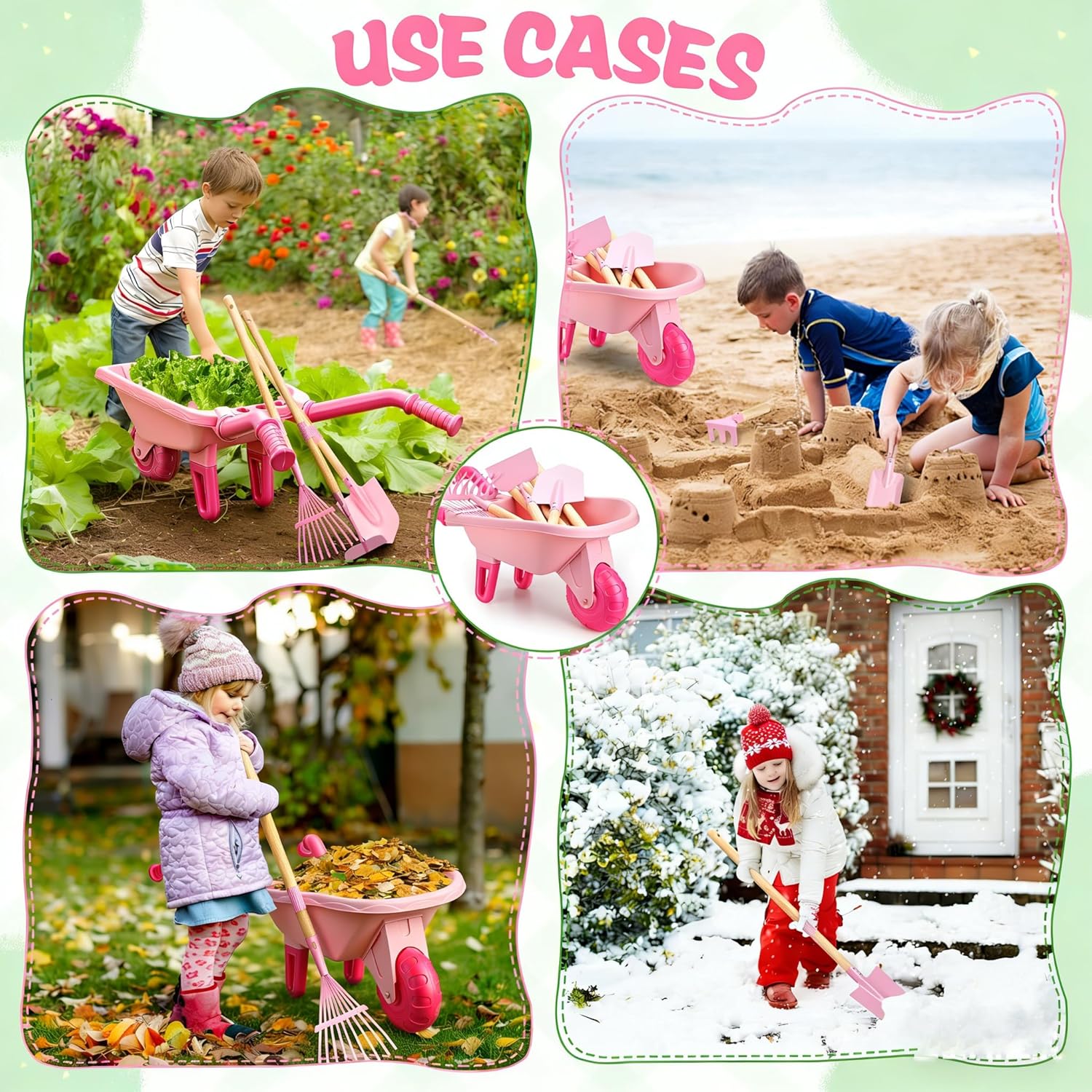 | Included Components | 3 Small Handle Wooden Tools (2 Shovels, Rake), 8 Fruit & Vegetable Stickers, Kids Gloves, Spray Bottle, 4 Long Handle Wooden Gardening Tools (Shovel, Rake, Hoe, Leaf Rake), Wheelbarrow |
