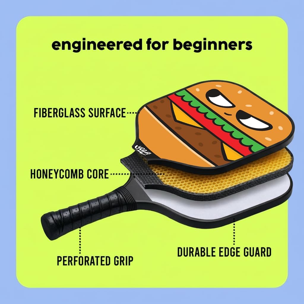 Kickstart your child’s pickleball journey with this Kids Pickleball Paddle Set, including 2 paddles and 2 pickleball balls—perfect for backyard games, parks, or court play. Designed for kids ages 4-12, each paddle is lightweight, easy to control, and features a comfortable, perforated grip made for smaller hands. Yoza paddles make pickleball super fun for kids. Stand out with a unique dual-faced design, letting kids show off different faces while they play. The burger and fries theme adds personality and energy to every match, making it a hit with young players. Whether they’re rallying with friends or learning the basics, this set brings fun to every game.