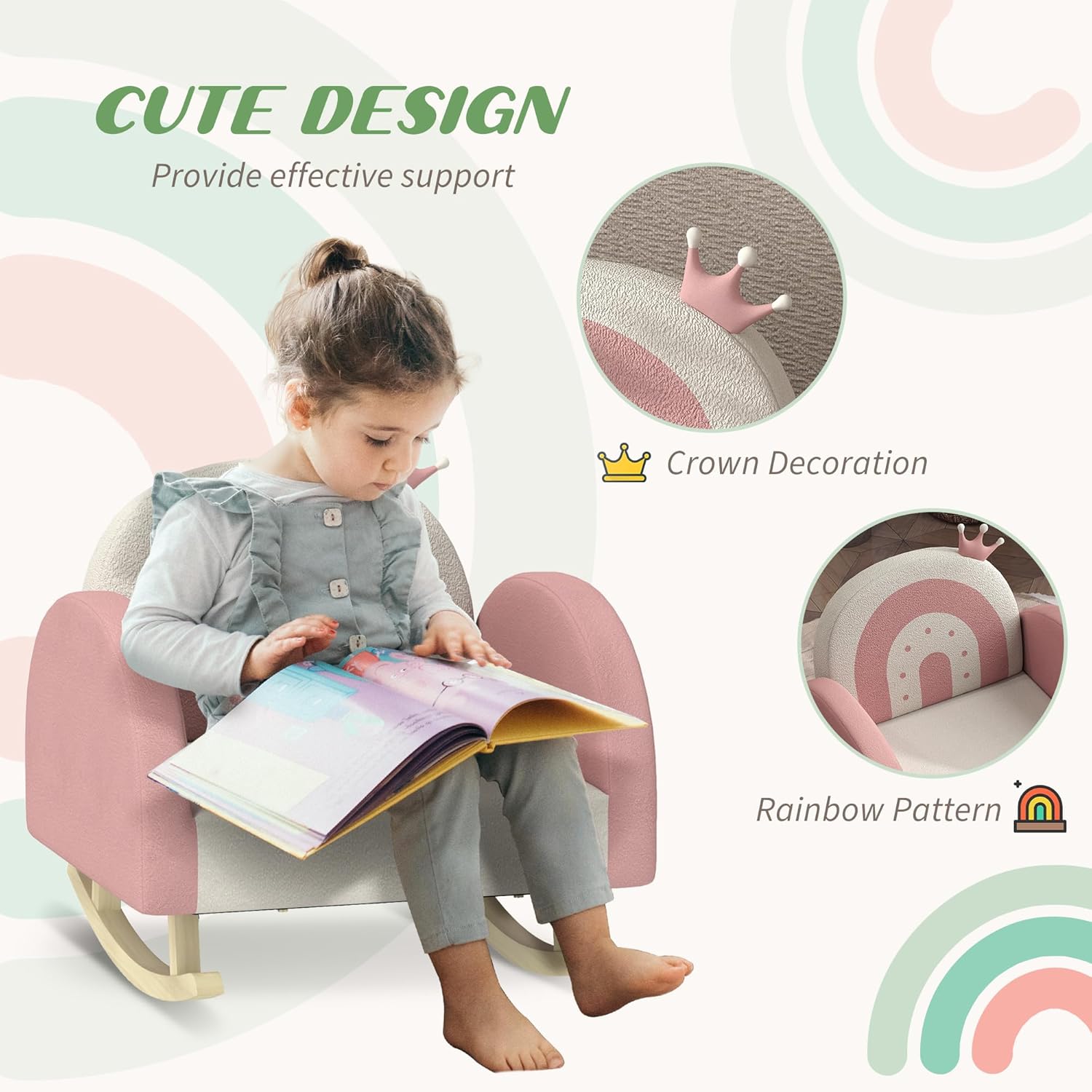 Features: - The rocking function soothes and relaxes children - Crown decoration on top - The rainbow pattern adds a vibrant, playful touch - A velvet surface ensures a soft, comfortable seat - It's great for bedrooms and playrooms - Easy assembly - Suitable for children aged 18 months to 3 years old. Specification: - Color: Pink - Materials: Wooden, Foam - Overall Dimensions: 19.7" W x 18.5" D x 19.3" H - Seat Size: 15.2" W x 12.2" D - Seat Height: 9.8" H - Back Rest: 15" L x 2" D x 9.8" H - Armrest: 15.6" L x 2" W x 14.2" H - Weight Capacity: 99 lbs. - Recommended Age: 18 months - 3 Years Old - Qualification Age: 18+ months Package Includes: - 1 x Kids Armchair - 1 x Manual