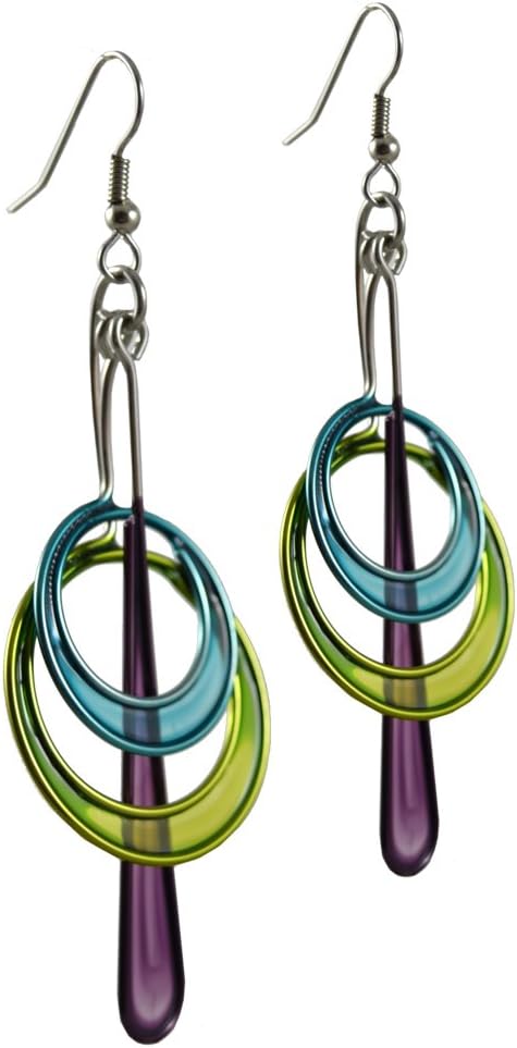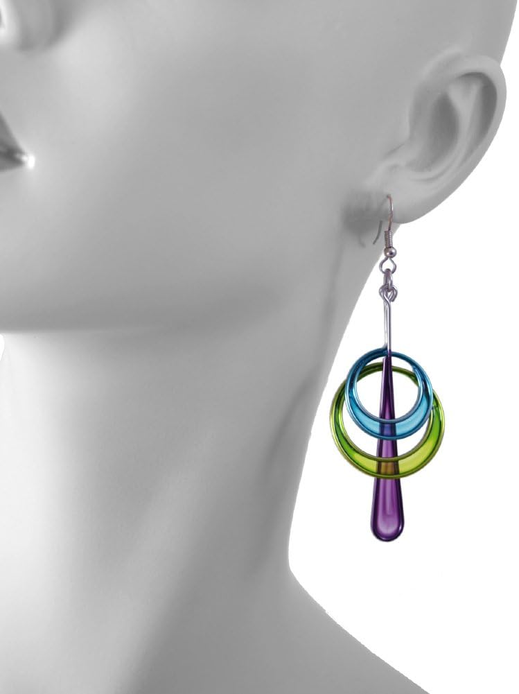 Drawing inspiration from his own success with kinetic sculptures and influential mobile artists such as Alexander Calder, artisan Christopher Royal handcrafts little works of modernist art for your ears! With an unusual combination of stainless steel and translucent dyed resin, his playful earring collection focuses on the beauty of balance and color. His 'Double Orbit' Earrings feature artistic drops of purple encompassed by halos of blue and green. 3" length with surgical steel ear wires. Made by hand in the USA.