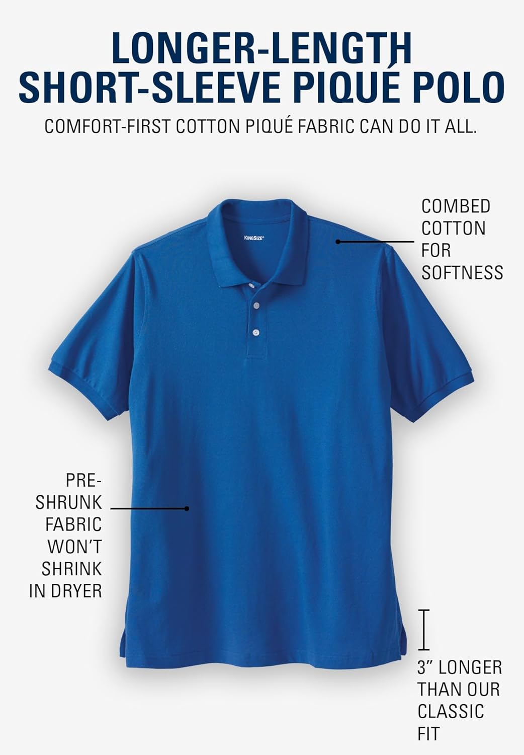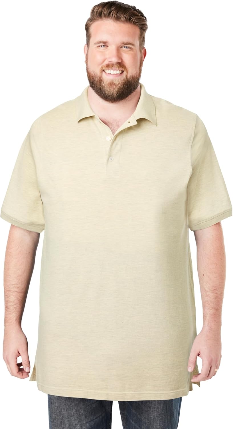 About This Product The Big and Tall Longer Length Polo from KingSize is made for men who want comfort that lasts with coverage they can depend on. Our Longer-Length Shrink-Less Cotton Polo Shirt is crafted from breathable, lightweight cotton designed to stay soft, keep its shape, and never shrink in the wash. With its extra length for a gap-free fit that moves with you, this men’s big and tall lightweight polo shirt delivers all-day comfort and a long-lasting fit. Features: Relaxed fit; generously made for the big and tall guybr>Shrink-Less fabric; maintains it's shape and colorbr>Big abt. 35"; Tall abt. 37"; 3" longer and taller than our standard teesbr>Ribbed knit collar and cuffs; adds structure and a polished finishbr>Three-button placket; a timeless detail br>Easy to wear alone or layer with sweatshirts, vest, and jackets Material and Care Solid colors: 100% cotton; Lightweight and breathable fabricbr>Heather colors: cotton/polyester; a durable and lightweight blendbr>Machine wash; easy low maintenance carebr>Imported Order Big sizes if you are 6'1" or shorter. Order Tall sizes if you are 6'2" or taller.