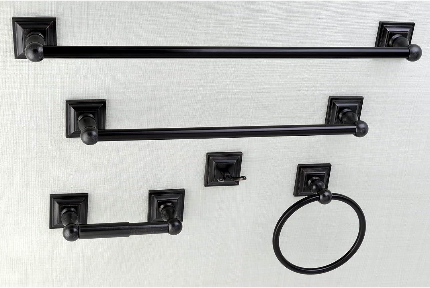 This all inclusive set of bathroom accessories features intricate detailing for a luxurious and astonishing style. Any bathroom will be given an added boost of opulence from these coordinated pieces. Two towel bars, towel ring, robe hook, and a toilet paper holder are included for all of your hanging storage needs. Available in multiple, durable finishes.