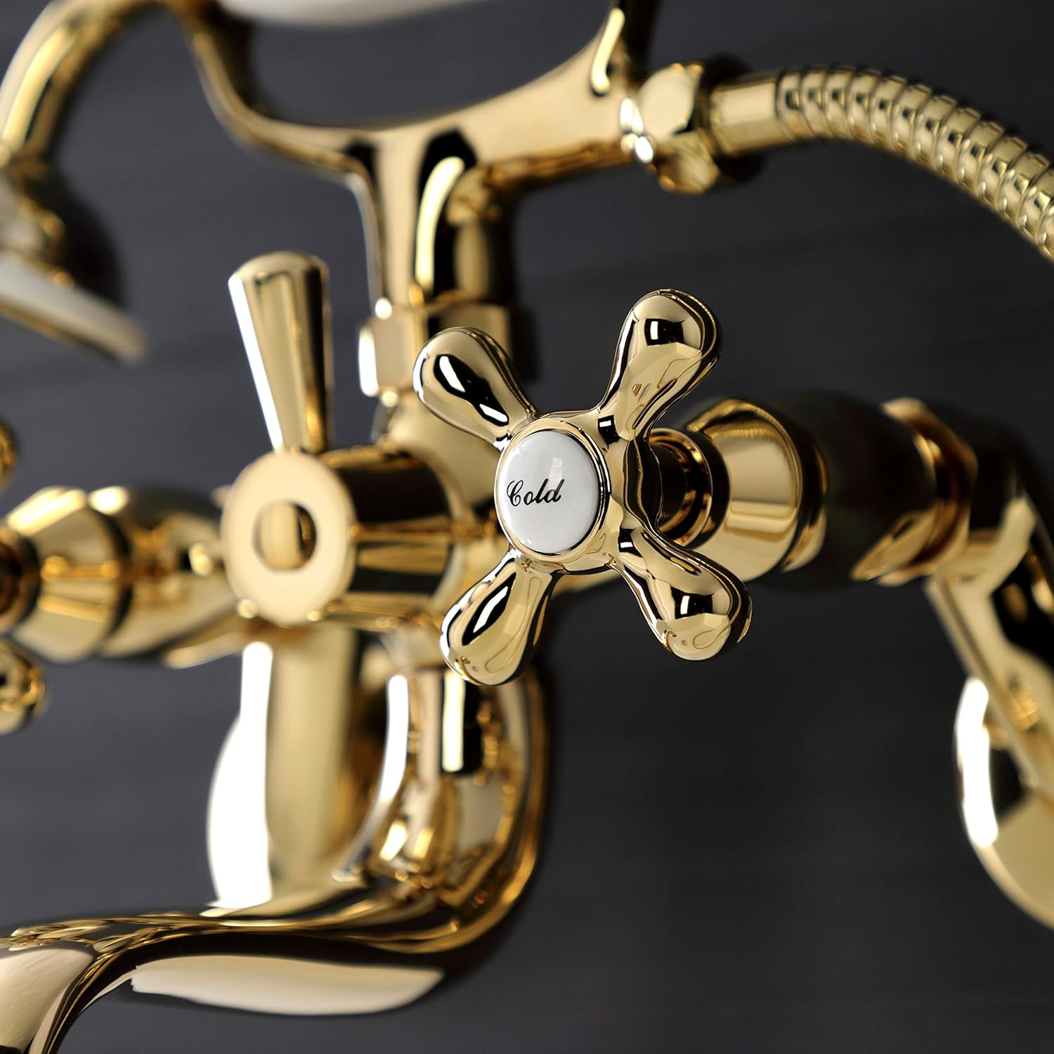 Wall mount clawfoot tub faucets are the perfect fixture to add decorative flair within your bathroom because of their unique architectural elements. With vintage opulence, this will complete your refined bathroom decorum with the help of its premium polished brass finish and traditionally styled handheld shower. The solid brass construction also makes for a heavy, quality made product. Hand shower with porcelain handle and 59-inch hose.