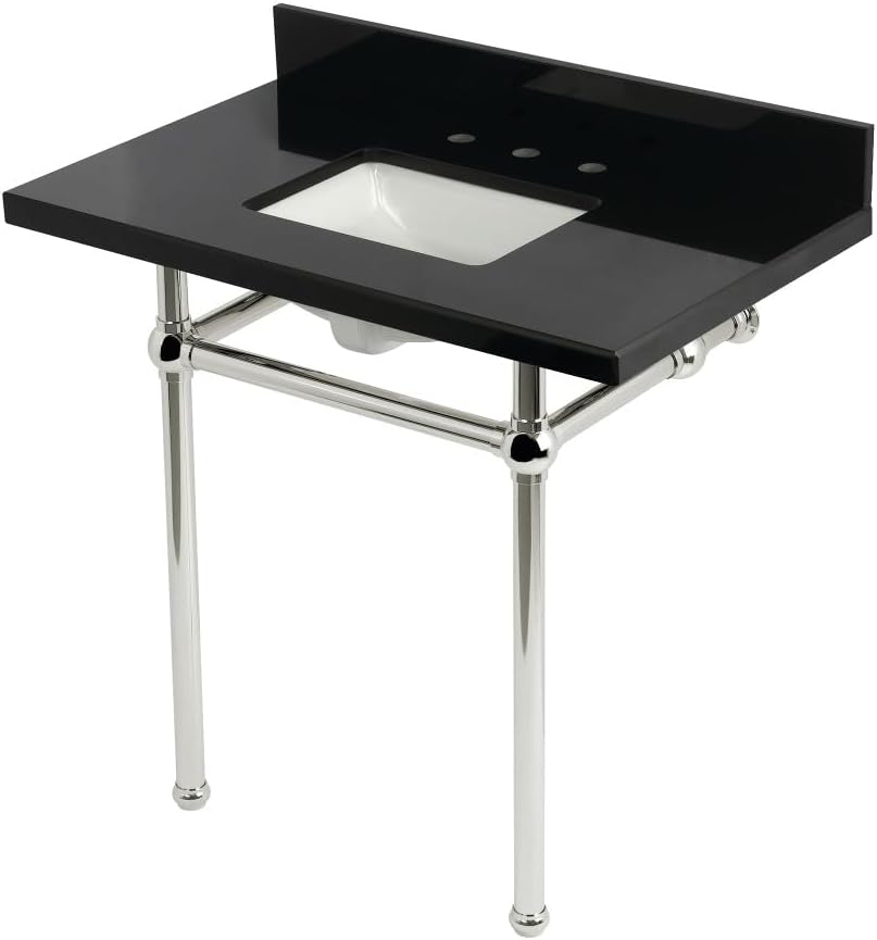 Enhance your bathroom with this exquisite console sink set featuring decorative traditional legs and a stunning black granite countertop. Designed for durability and longevity, this set is a perfect solution for compact or tight spaces. It comes complete with an pre-installed undermount rectangular basin, ensuring effortless maintenance. The flawless, stain-resistant surface of the countertop and the gleaming finish of the legs make this set a captivating centerpiece in your bathroom decor. Please note that the water supply kit, drain assembly, and faucet are sold separately, allowing you to customize your choices according to your personal style and preferences.