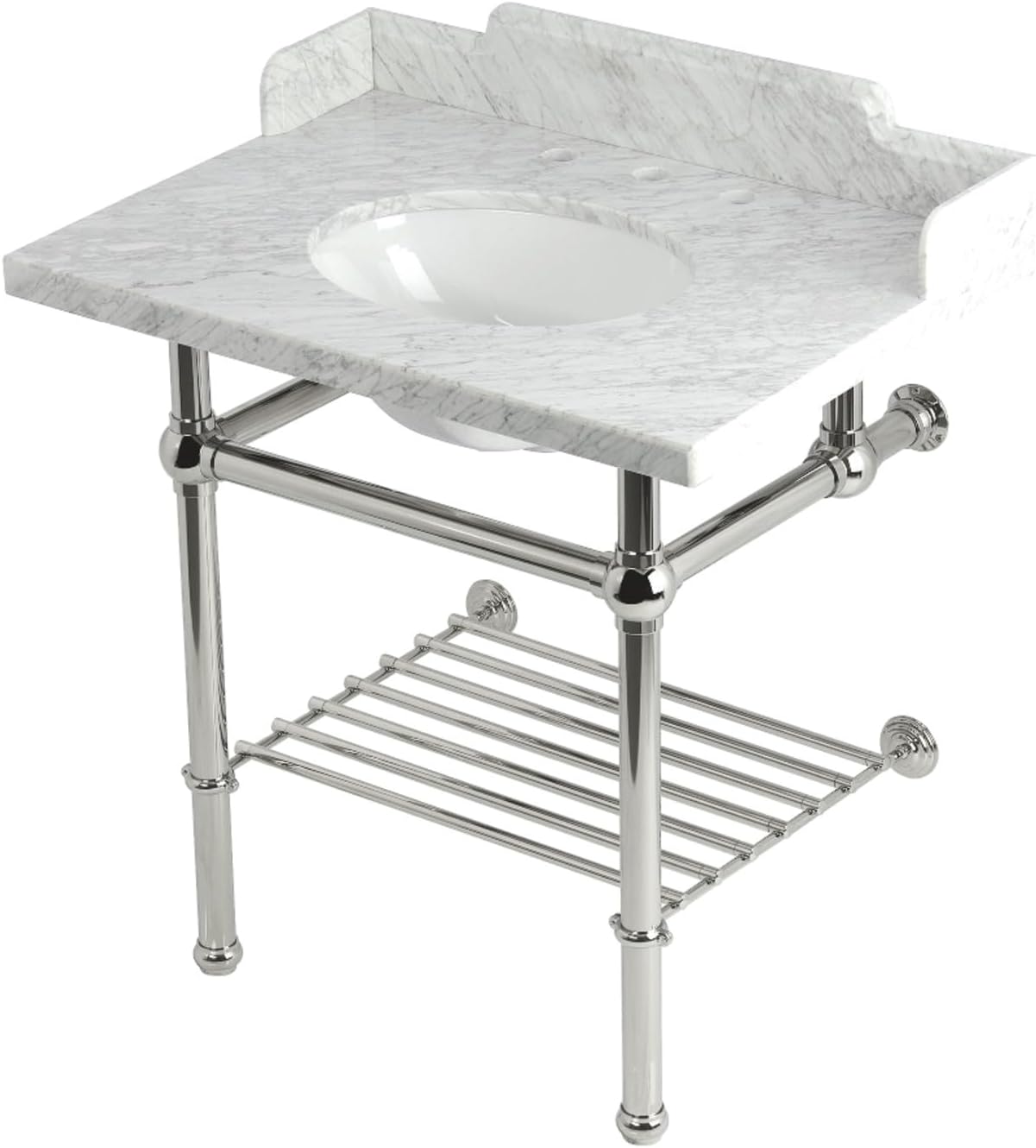 Enhance your bathroom with this exquisite console sink set featuring decorative traditional brass legs and a stunning Carrara Marble countertop. This set is designed for long-lasting durability and is perfect for compact or tight spaces. It comes complete with a pre-installed undermount oval basin, ensuring effortless maintenance. The countertop's flawless, stain-resistant surface and the brass legs' gleaming appearance make this set a captivating centerpiece in your bathroom decor. Please note that this set includes decorative backsplash and partial side splashes as well as a shelf that will help you maximize your storage space while adding a touch of elegance; however, the water supply kit, drain assembly, and faucet are sold separately, allowing you to customize your choices according to your style and preferences.