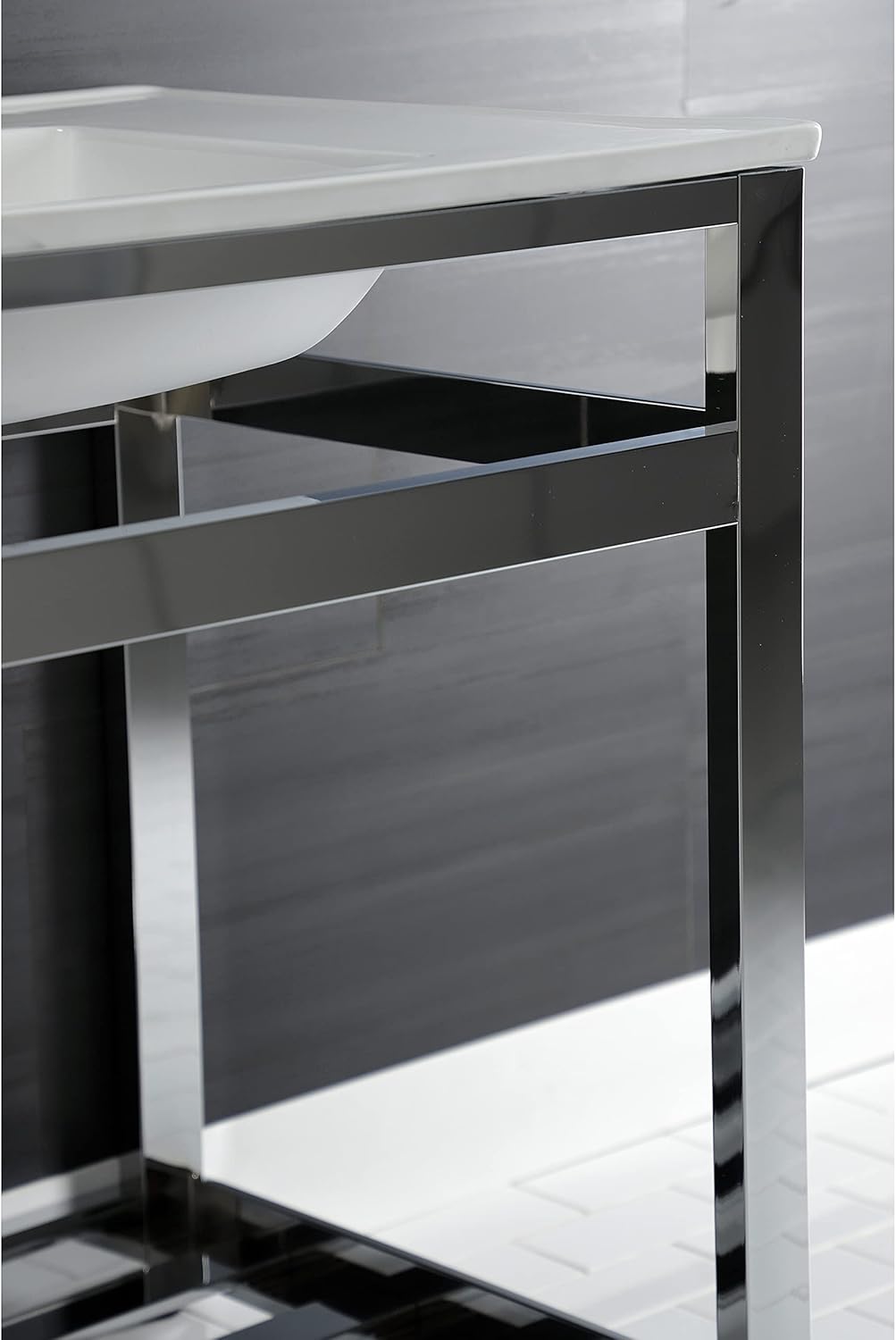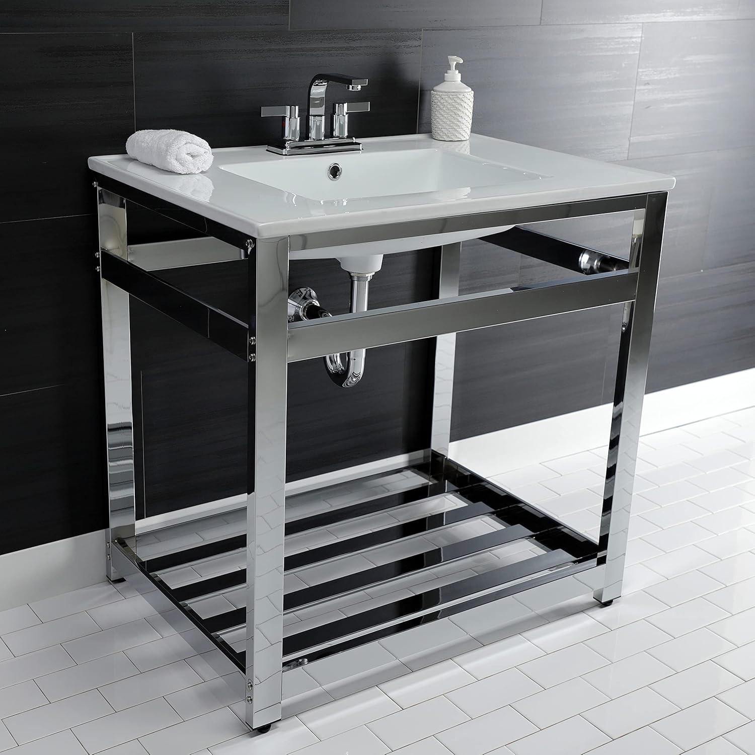 Exquisitely styled for your contemporary taste, this console sink will enhance your bathroom living space. With a beautiful ceramic counter top, this console sink set is a long lasting, durable, and elegant addition to your bathroom. The Kingston Brass 31-inch ceramic console sink (4-inch, 3-hole) features a wash basin and steel base that is available in a handful of finish options. Solid ceramic sinks and tops like the LBT-series top in this listing are finished with a glossy glaze on the top and sink basin interior, making for a pristine, stain-resistant surface and glistening finish that is easily maintained. The underside and basin exterior are unglazed/unfinished and coated with a matte white protective sealant that prevents moisture absorption and staining. Solid ceramic pieces cannot be glazed on all sides, because the nature of ceramic material requires a minimum surface area be left raw during the glaze firing process so the piece does not explode. Water supply kit, drain assembly, and the faucet are sold separately.
