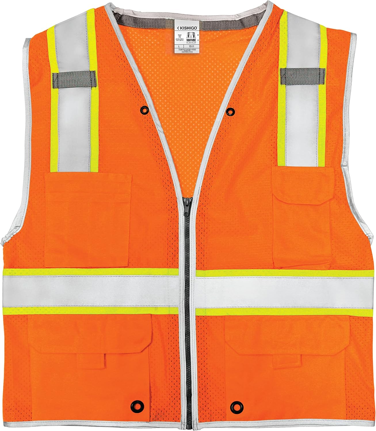 The Kishigo Brilliant Series Class 2 Safety Vest offers unmatched visibility. This innovative hi-vis vest combines 2"W silver reflective stripes with Brilliant Trim reflective edging, outlining your upper body for enhanced traffic visibility. The Ultra-Cool 100% polyester mesh ensures comfort in hot weather. It features inside pockets, cell phone pockets, and patch pockets with scalloped flaps, along with a zipper-front closure and two lower outside cargo pockets with adjustable flaps. It meets ANSI/ISEA C107 Class 2 standards.