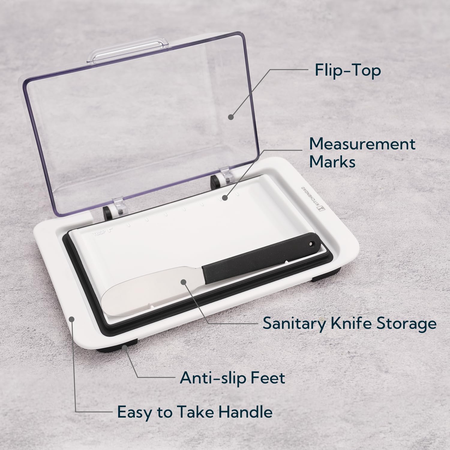• Flip-Top Butter Dish with Knife: The flip-top butter dish can effectively solve the problem of butter getting on the lid. The built-in knife is stored inside the plastic butter dish to keep it clean and tidy. Butter knife sits in a slot inside the dish so it won't fall out, get lost or get debris on it. No searching for the knife
