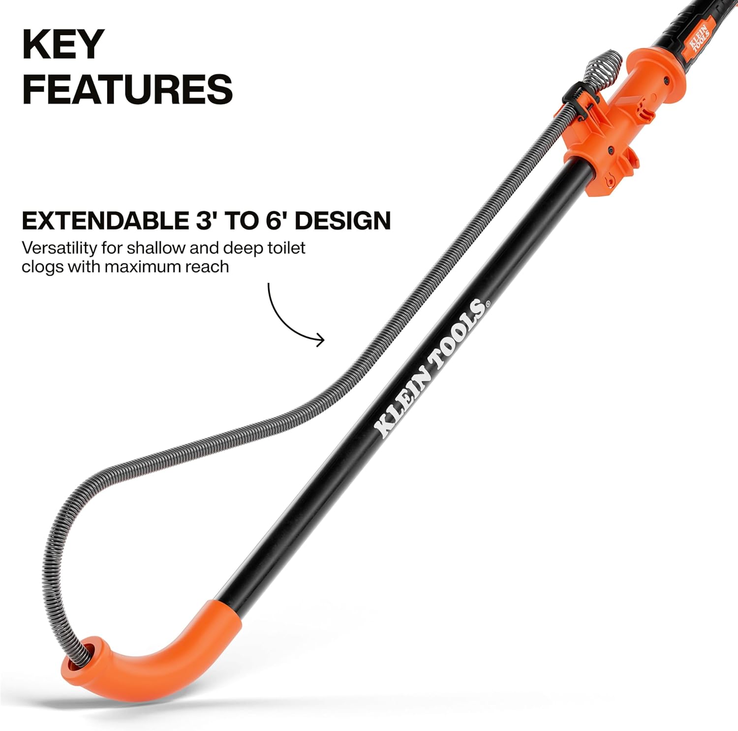 Klein Tools 6-Foot Steel Toilet Auger delivers maximum reach with extendable 3-Foot to 6-Foot capability for extended toilet clog removal. Hybrid manual and drill operation provides precise control and added power for tougher clogs. Quick-release handle, dual-lock storage, and protective boot enhance professional performance while the comfortable grip reduces fatigue during heavy-duty toilet unclogging applications. For more than 160 years, Klein Tools has manufactured premium-quality, professional-grade hand tools that deliver the performance, durability and precision needed to get the job done right. Our family of engineers, workers and craftsman continue to put six generations of expertise into every tool we create by using only the highest quality materials, superior workmanship, and keeping manufacturing as close to home as we can. Klein isn't just the name of our company, it's also our family name. And since we're an American company that's family-owned and family-run, you know you can count on us to be here tomorrow. Klein Tools doesn't just make great products, we make great products that stand up to the demands of the professionals who use them every day ... Since 1857.