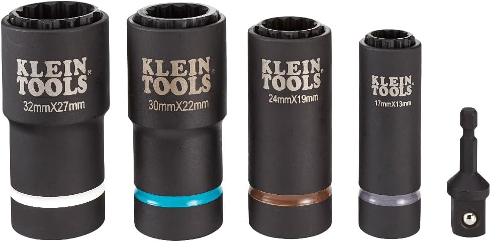 Featuring 8 sizes in 4 easy-to-carry sockets, this 5-Piece, 2-in-1 Impact Socket Set consists of the most common metric socket sizes used in electrical and construction work. Each impact socket features two coaxial spring-loaded sockets in one. The high-torque, 12-Point design is easier to position on fasteners including square ones. Includes a 1/4-Inch hex by 1/2-Inch adapter and convenient carrying case. For more than 160 years, Klein Tools has manufactured premium-quality, professional-grade hand tools that deliver the performance, durability and precision needed to get the job done right. Our family of engineers, workers and craftsman continue to put six generations of expertise into every tool we create by using only the highest quality materials, superior workmanship, and keeping manufacturing as close to home as we can. Klein isn't just the name of our company, it's also our family name. And since we're an American company that's family-owned and family-run, you know you can count on us to be here tomorrow. Klein Tools doesn't just make great products, we make great products that stand up to the demands of the professionals who use them every day ... Since 1857.