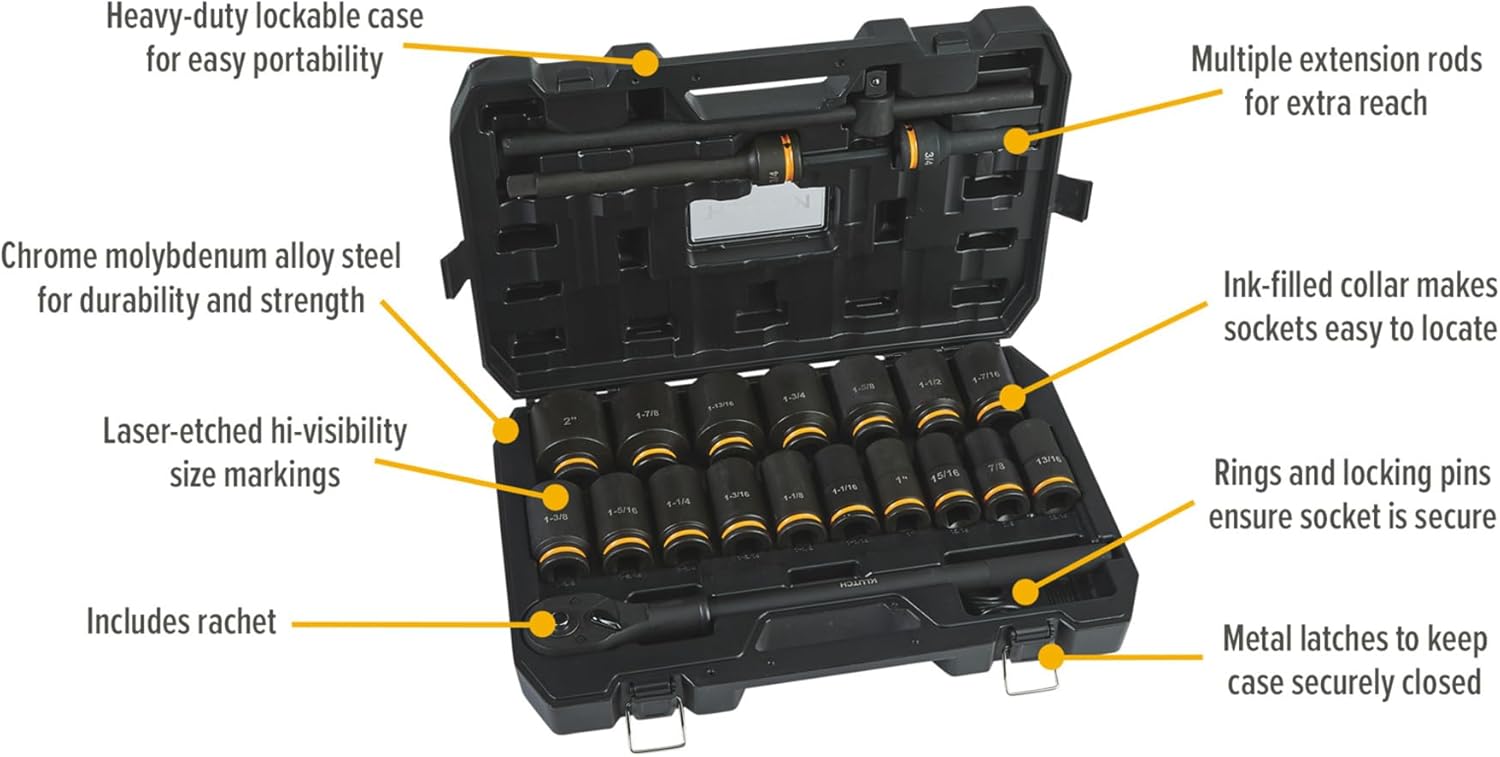 The Klutch Jumbo Deep Impact Socket Set includes 21 pieces and features a 3/4in. drive. This set is made of forged chrome-molybdenum steel for high-strength and durability. It includes deep sockets, ratchet and extensions. Patented sidewall drive sockets apply force to walls of fastener for long life and higher torque. Dual-hole socket and included ring with locking pin ensure socket is secure. Manganese phosphate finish resists rust and corrosion. Heavy-duty lockable plastic carrying case for easy portability. Storage case has sockets sizes marked for easy organization. Lifetime guarantee.